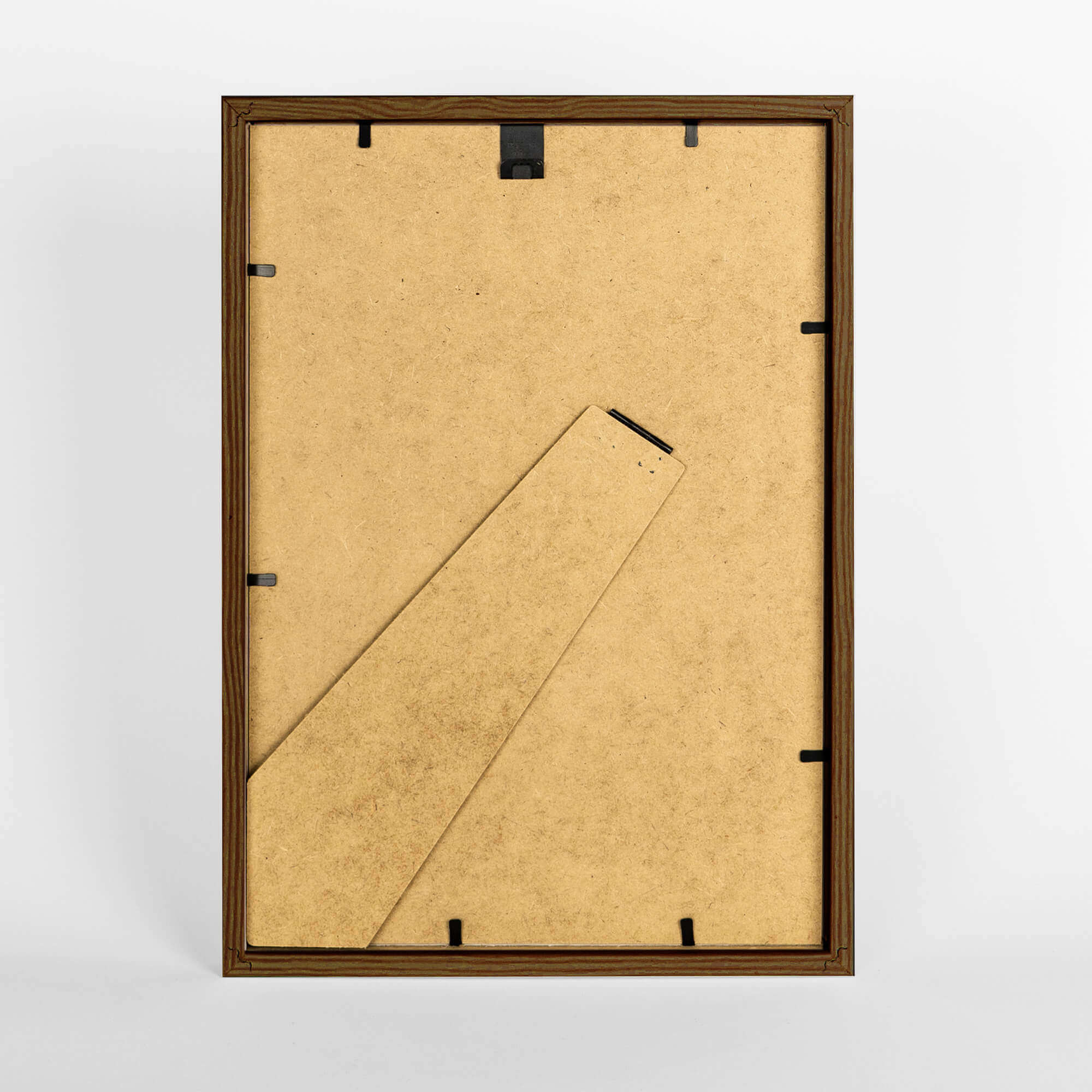 Foto Galeria z Passe Partout brązowa wykonana jest z ekologicznego MDF o profilu 13 mm (szerokość) i 20 mm (wysokość). Z przodu chroniona jest szkłem organicznym - plexi, a z tyłu twardą płytą HDF. Elastyczne blaszki pozwalają na wielokrotne otwieranie i wymienianie zdjęć. Foto galerię można powiesić na ścianie zarówno w pionie i poziomie, można ją również postawić na płaskiej powierzchni, dzięki zamontowanej stopce.
