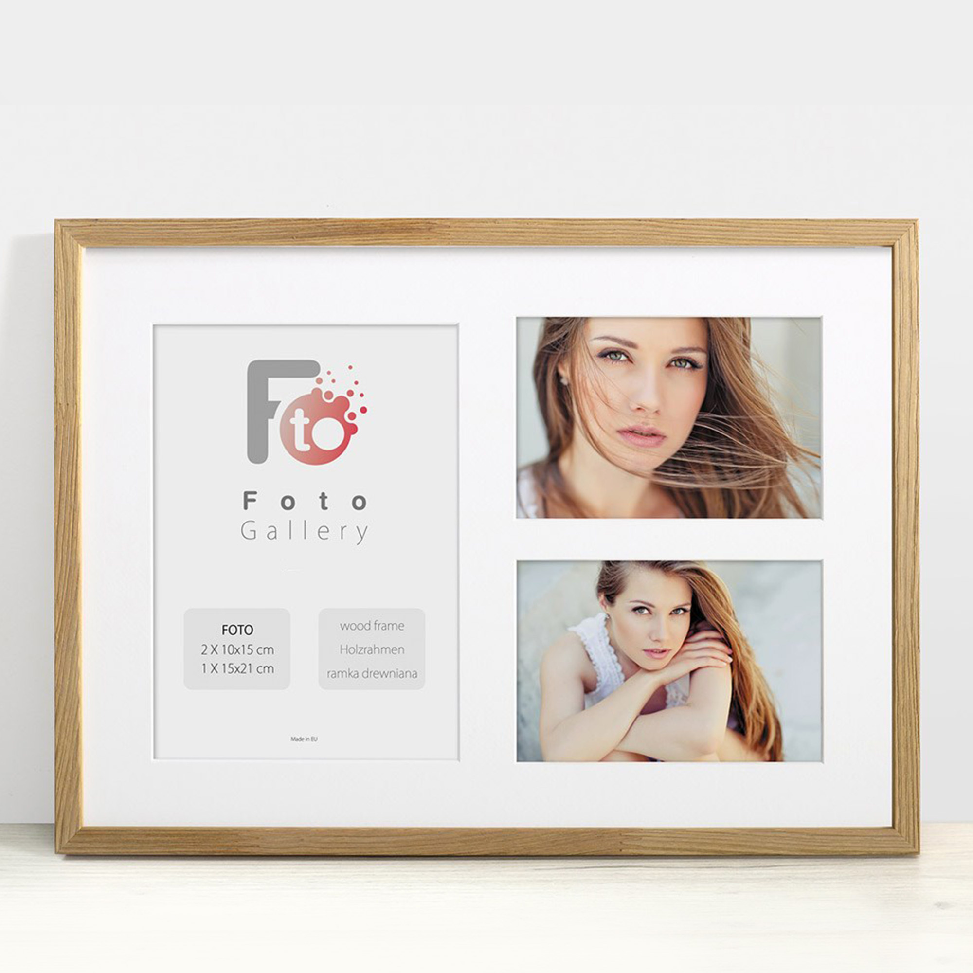 - Foto galeria Natural - drewniana ramka z passe partout do oprawy zdjęć 1 x 15x21, 2 x 10x15 cm. Wymiar wewnętrzny kompozycji 28x39 cm.