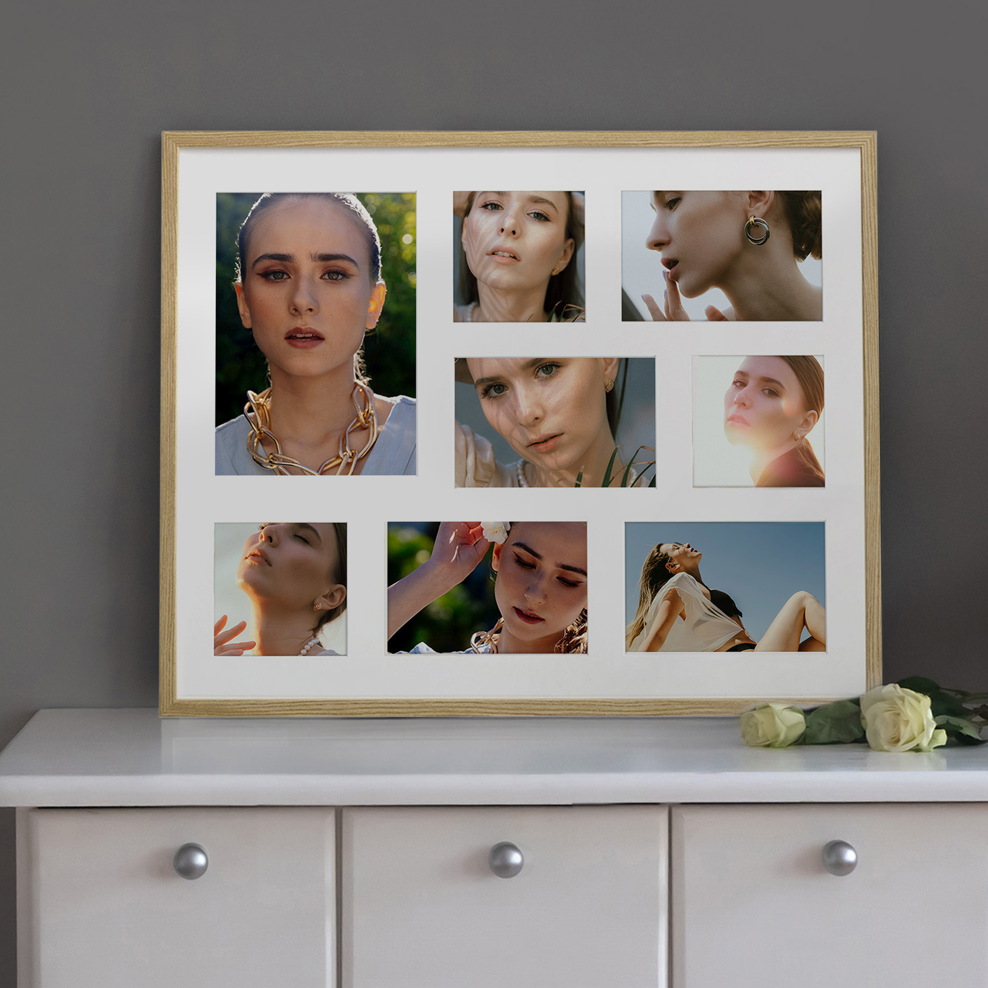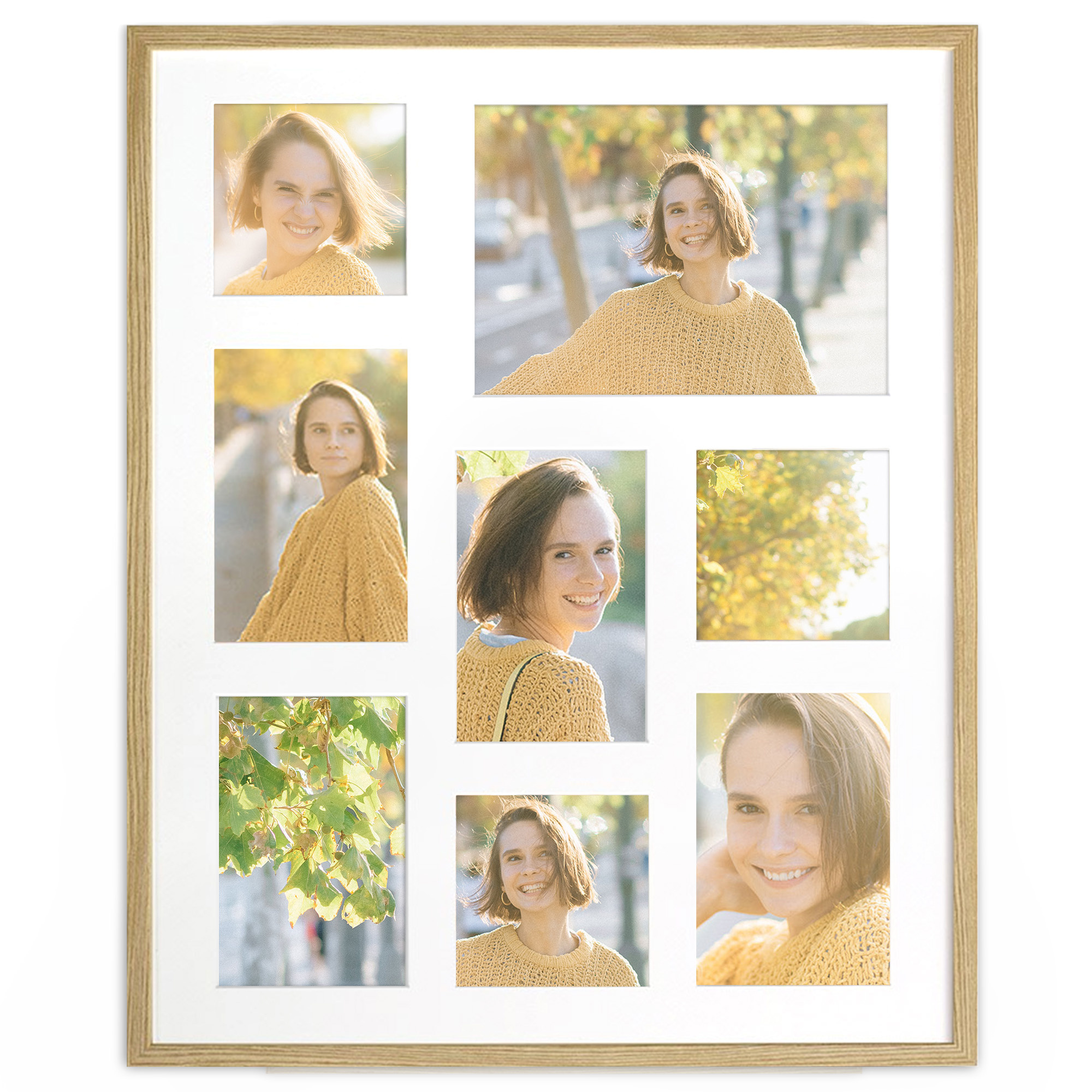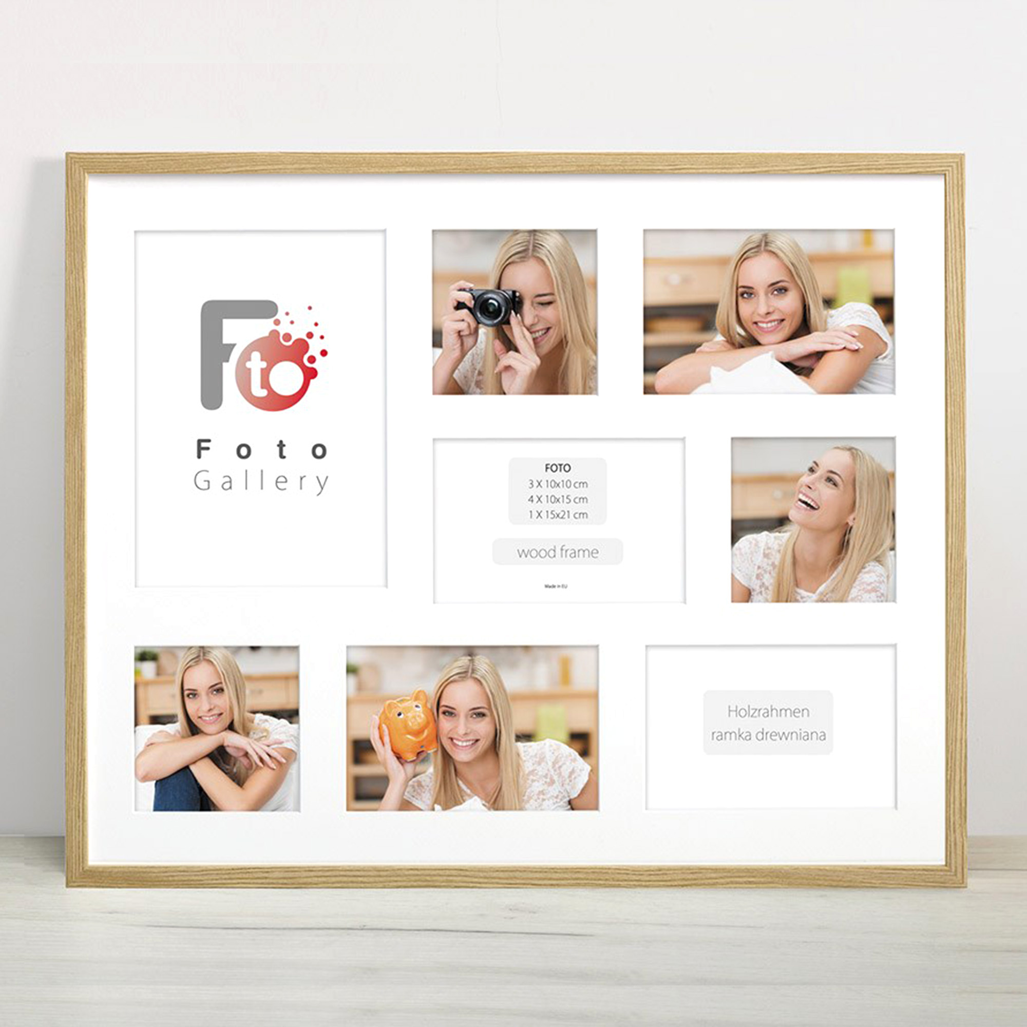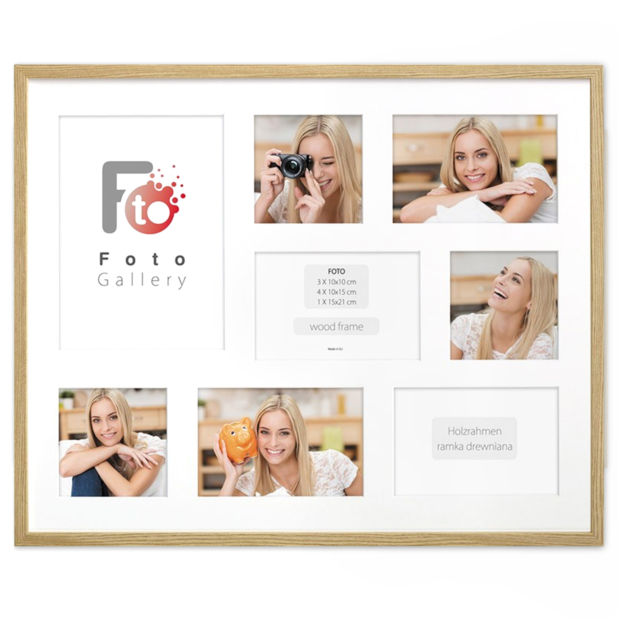 • Foto galeria Natural - drewniana ramka z passe partout do oprawy zdjęć 1 x 15x21cm, 3 x 10x10cm, 4 x 10x15cm. Wymiar wewnętrzny kompozycji 40x50 C cm.