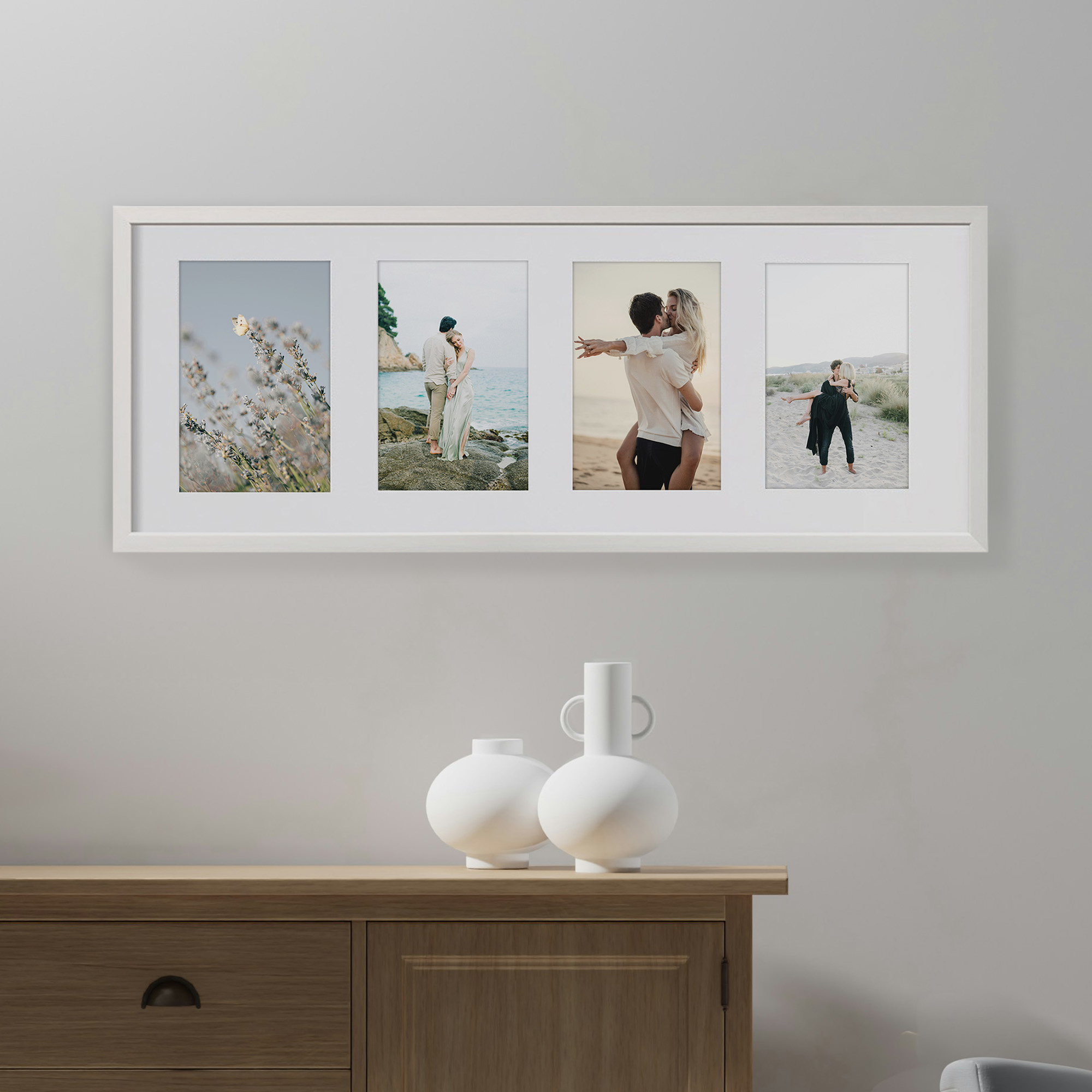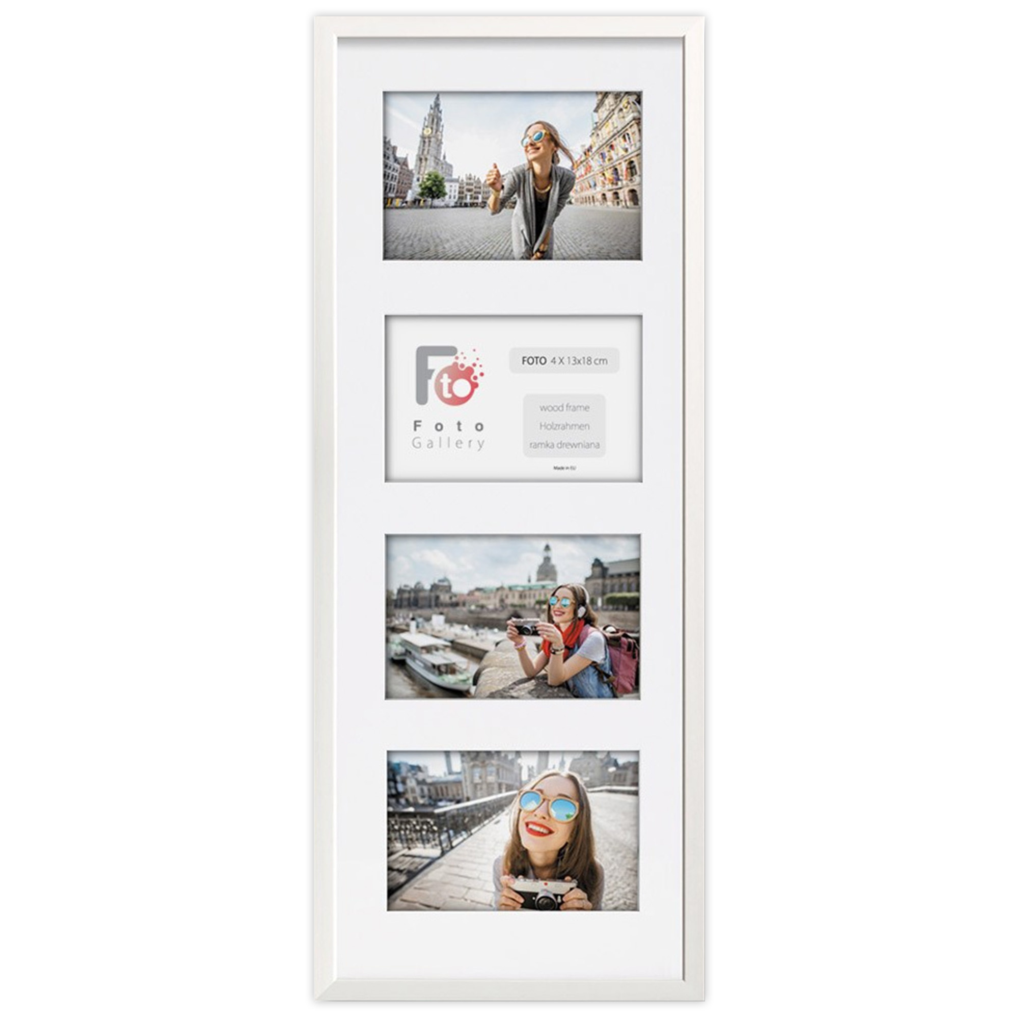 - Foto galeria White - drewniana ramka z passe partout do oprawy zdjęć 4 x 13x18cm. Wymiar wewnętrzny kompozycji 23x66 cm.