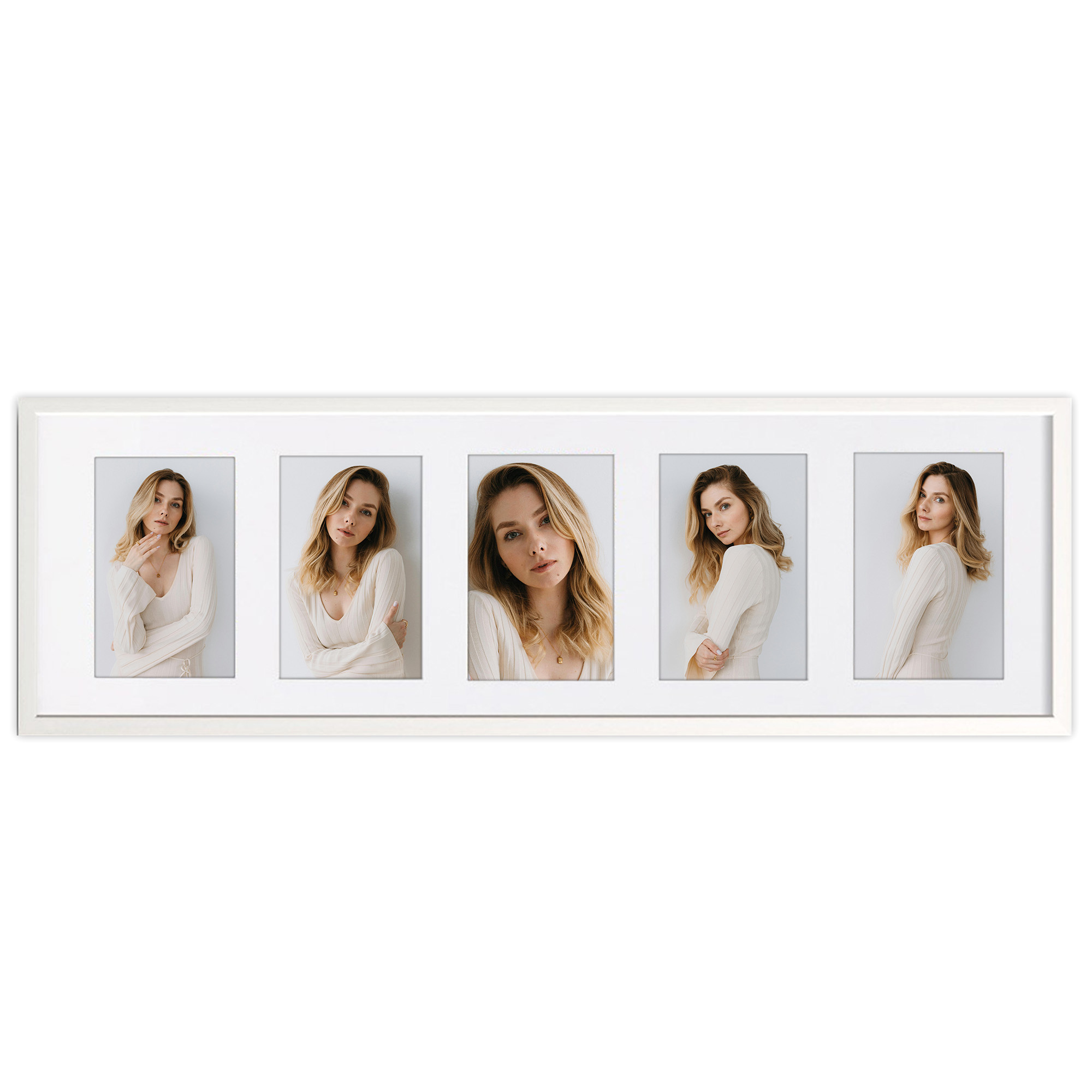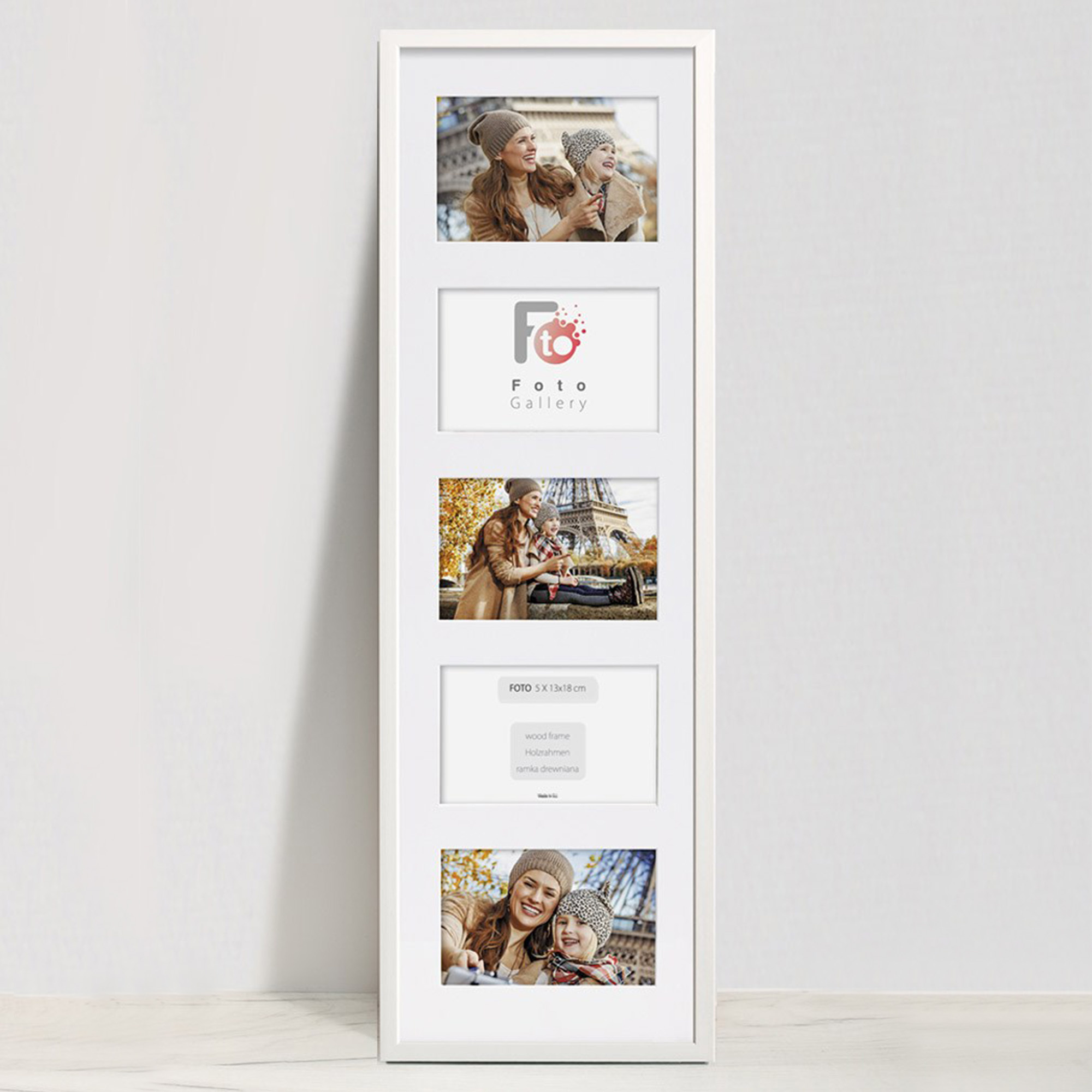 • Foto galeria White - drewniana ramka z passe partout do oprawy zdjęć 5 x 13x18cm. Wymiar wewnętrzny kompozycji 23x81 cm.