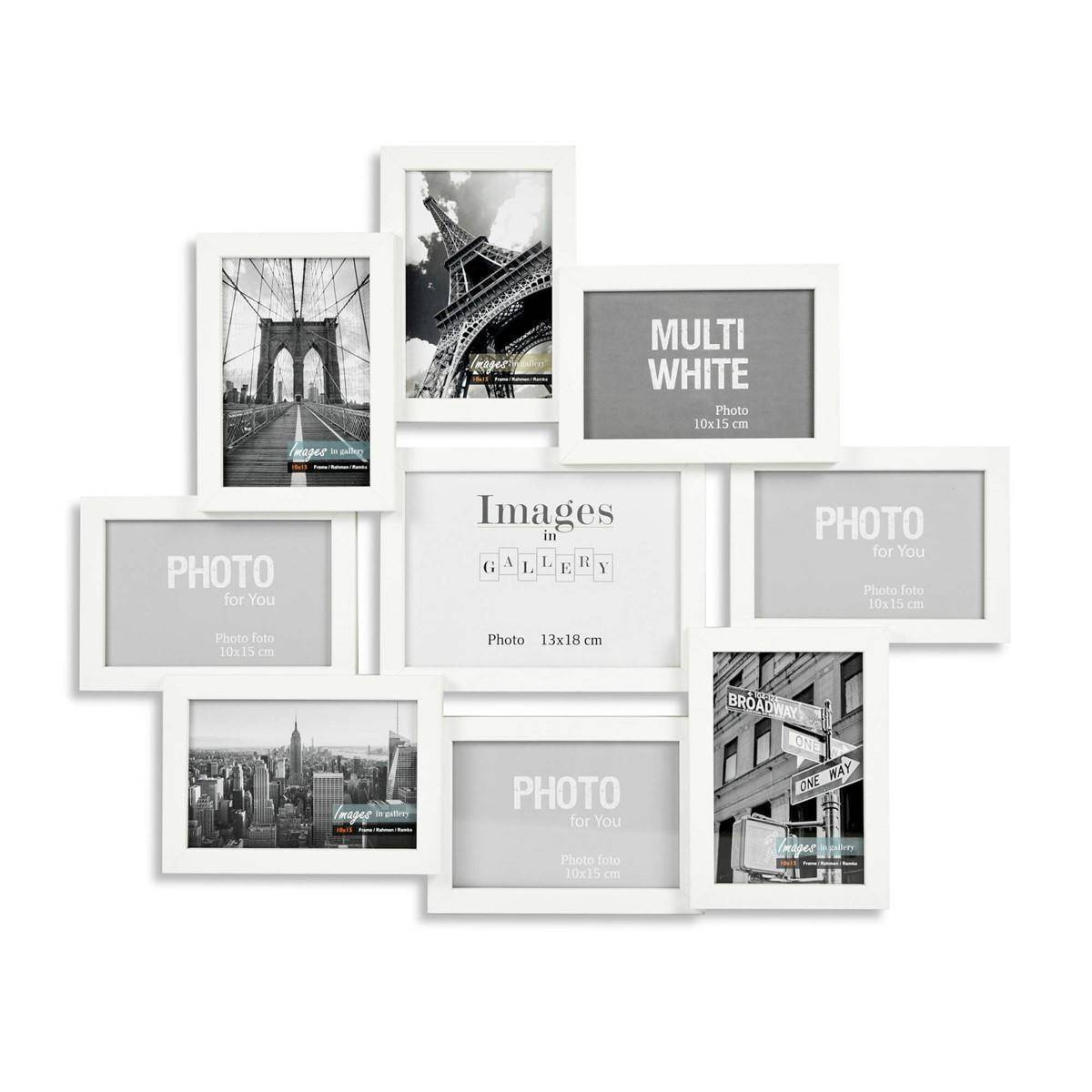 - Multirama biała z kolekcji MULTI WHITE 91 to ramka drewniana na 9 zdjęć o wymiarach: 8x 10x15 cm, 1x 13x18 cm. Przekrój profilu: 14x13 mm.