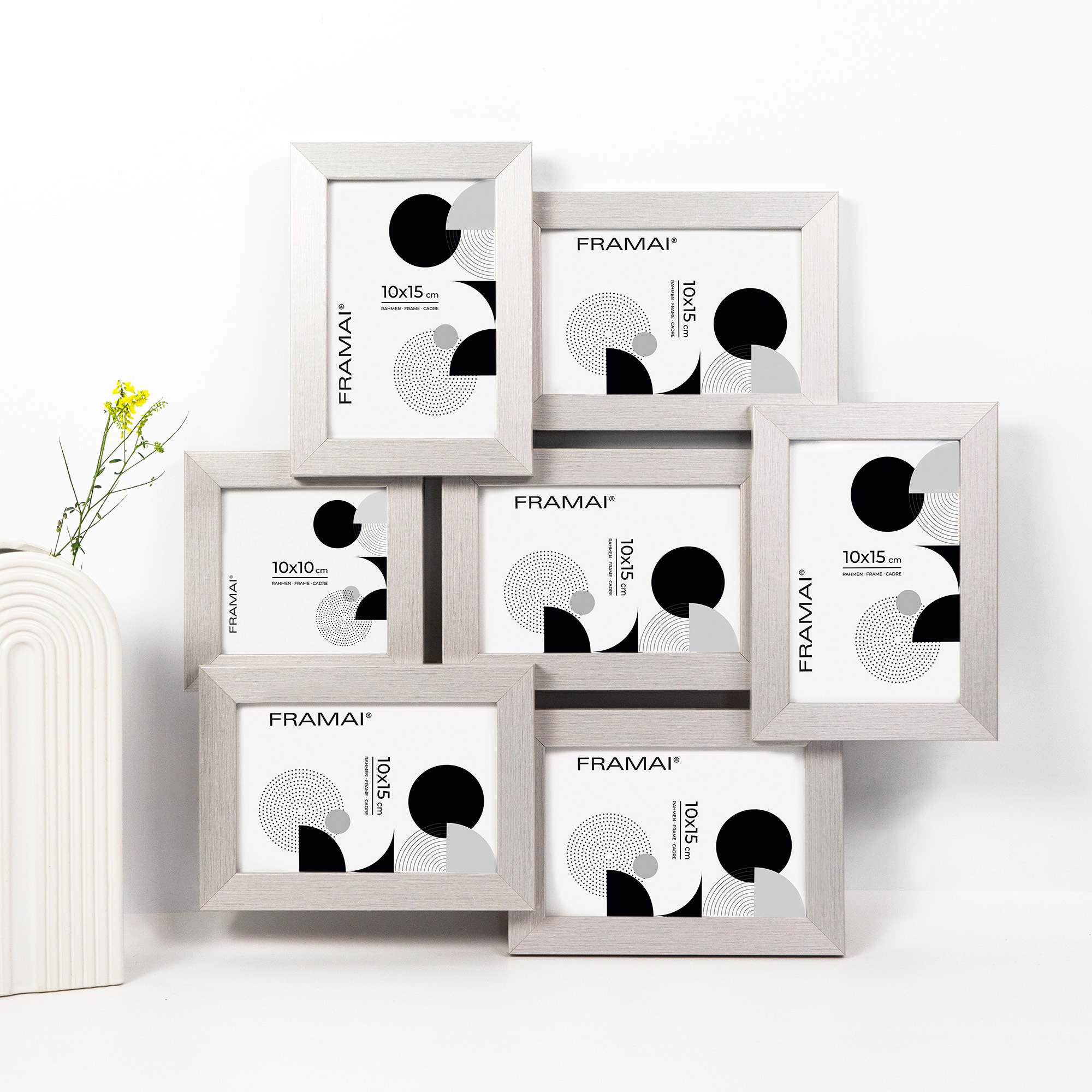 Multirama HEN S to stylowa ramka na 7 zdjęć, idealna do stworzenia eleganckiej domowej galerii. Pomieści sześć zdjęć o wymiarach 10x15 cm i jedno zdjęcie o wymiarach 10x10 cm, a jej satynowe wykończenie w eleganckim srebrnym kolorze sprawdzi się w każdym wnętrzu. Wykonana z wysokiej jakości ekologicznego MDF, z nietłukącą się plexi oraz solidnym tyłem z płyty HDF, multirama ta zapewnia estetykę, trwałość i stabilność.