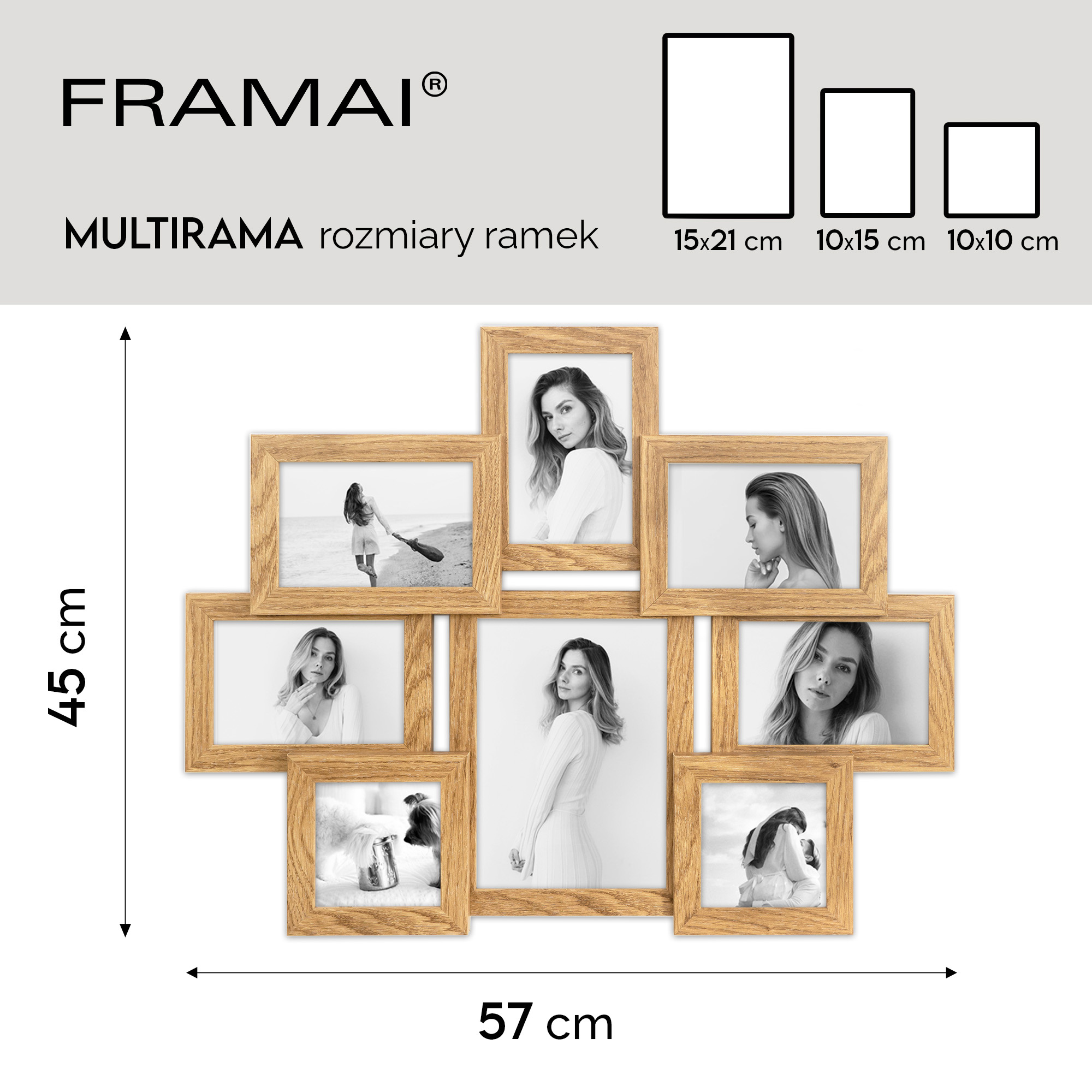 Multirama HEN 01 to stylowa ramka na 8 zdjęć, idealna do stworzenia eleganckiej domowej galerii. Pomieści pięć zdjęć o wymiarach 10x15 cm, dwa zdjęcia 10x10 cm i jedno zdjęcie 15x21 cm, a jej naturalne wykończenie w klasycznym dębowym kolorze sprawdzi się w każdym wnętrzu. Wykonana z wysokiej jakości ekologicznego MDF, z nietłukącą się plexi oraz solidnym tyłem z płyty HDF, multirama ta zapewnia estetykę, trwałość i stabilność.