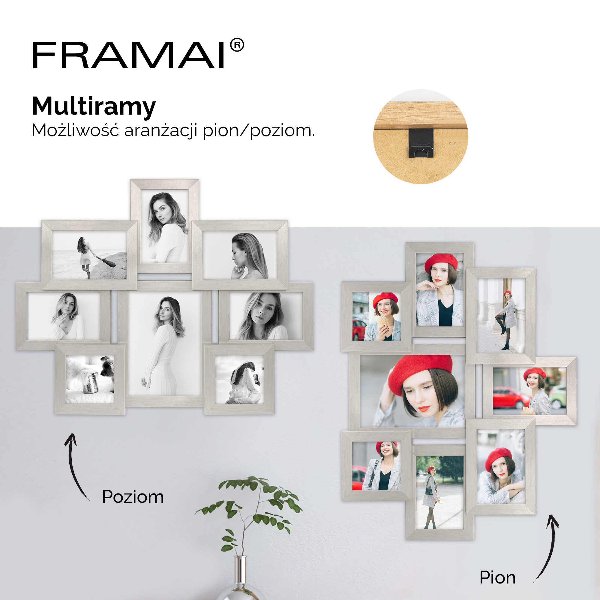 Konstrukcja multiramy wyróżnia się precyzyjnie wykonanymi narożnikami oraz trwałym montażem na stalowe wkręty, co gwarantuje solidność na długie lata. Dzięki elastycznym blaszkowym zapięciom, wymiana zdjęć jest prosta i szybka, co może sprawić radość całej rodzinie. Multirama posiada uniwersalną zawieszkę, dzięki której można ją wieszać zarówno pionowo, jak i poziomo, dopasowując do każdej aranżacji ściennej. Każda rama jest starannie zapakowana w tekturowe opakowanie oraz dodatkową folię ochronną, aby zapewnić bezpieczny transport i odbiór w nienaruszonym stanie.