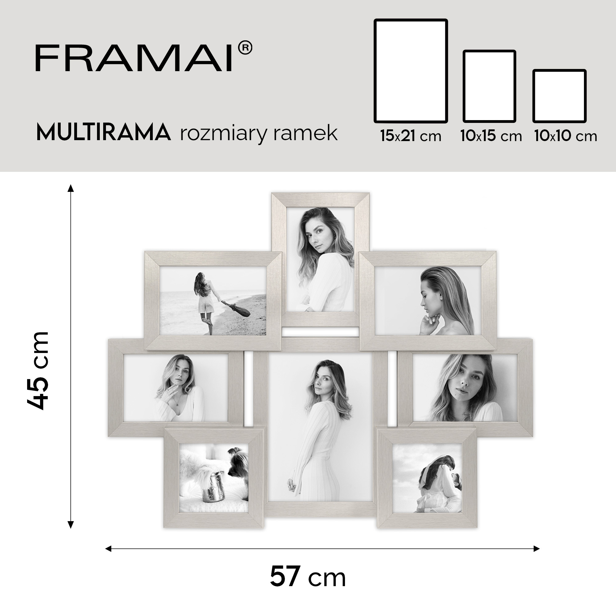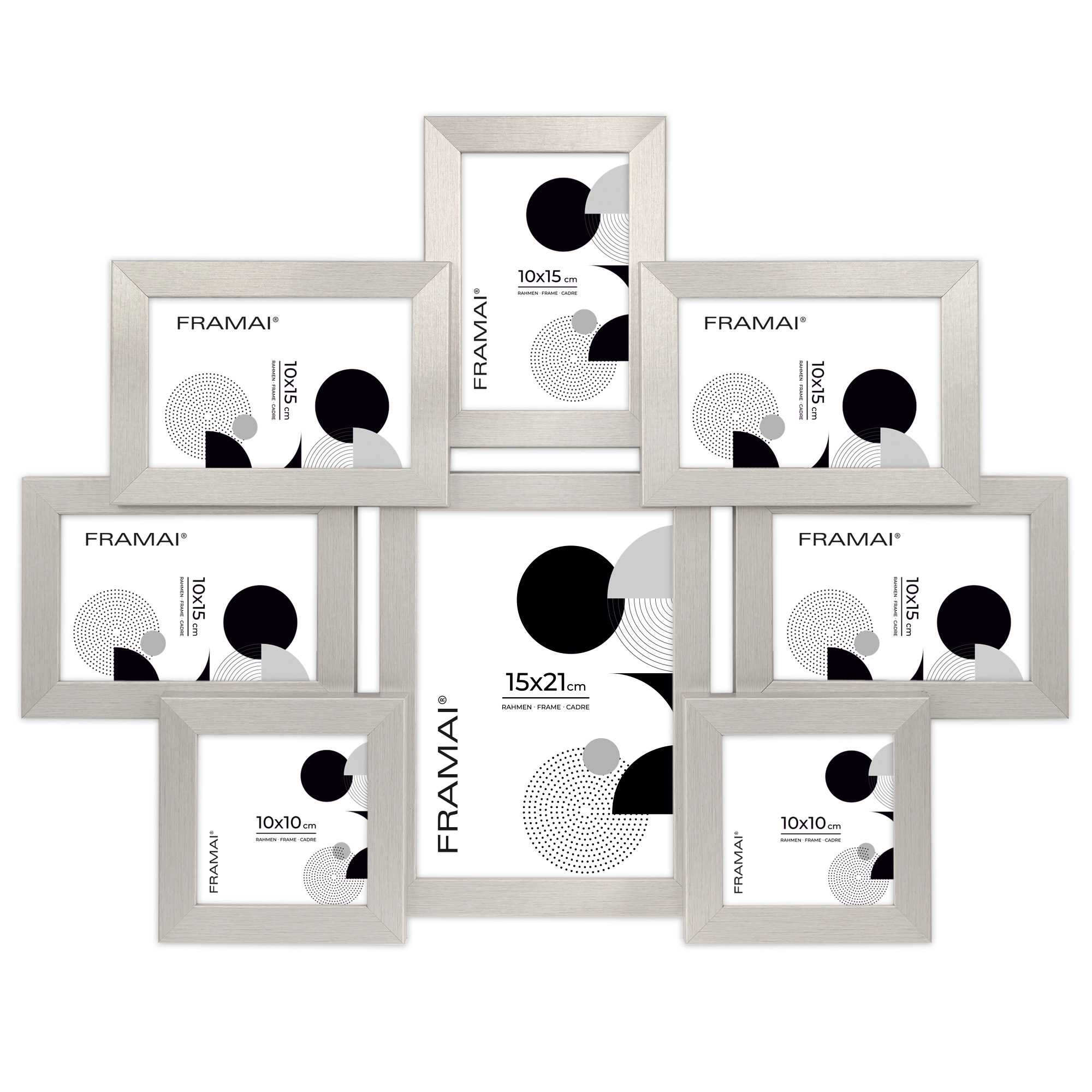 Multirama HEN S to stylowa ramka na 8 zdjęć, idealna do stworzenia eleganckiej domowej galerii. Pomieści pięć zdjęć o wymiarach 10x15 cm, dwa zdjęcia 10x10 cm i jedno zdjęcie 15x21 cm, a jej satynowe wykończenie w eleganckim srebrnym kolorze sprawdzi się w każdym wnętrzu. Wykonana z wysokiej jakości ekologicznego MDF, z nietłukącą się plexi oraz solidnym tyłem z płyty HDF, multirama ta zapewnia estetykę, trwałość i stabilność.