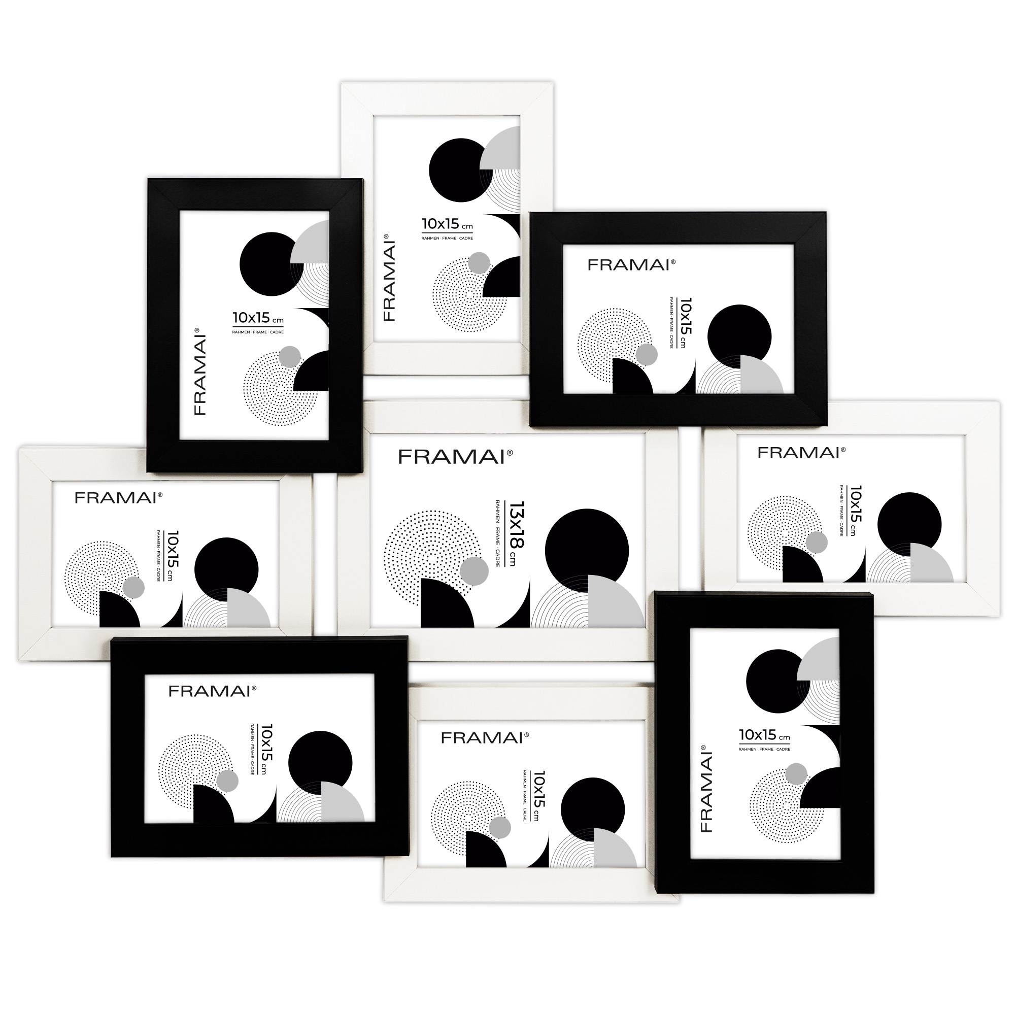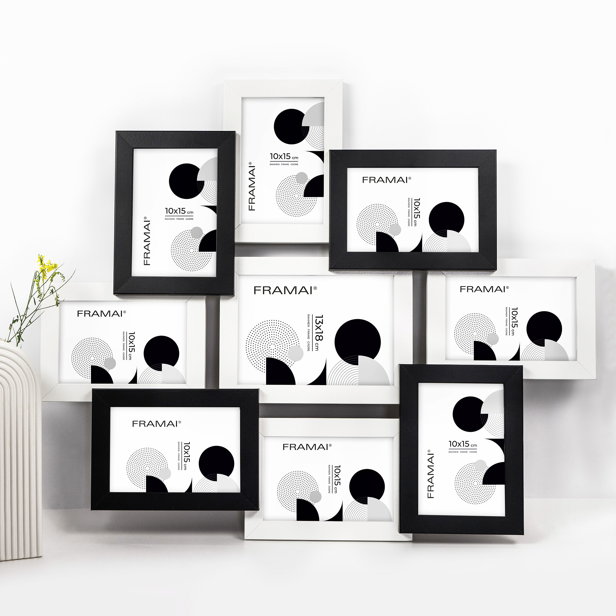 Multirama HEN 1-2 to stylowa ramka na 9 zdjęć, idealna do stworzenia eleganckiej domowej galerii. Pomieści osiem zdjęć o wymiarach 10x15 cm i jedno zdjęcie 13x18 cm, a jej matowe wykończenie w eleganckim czarno-białym kolorze sprawdzi się w każdym wnętrzu. Wykonana z wysokiej jakości ekologicznego MDF, z nietłukącą się plexi oraz solidnym tyłem z płyty HDF, multirama ta zapewnia estetykę, trwałość i stabilność.
