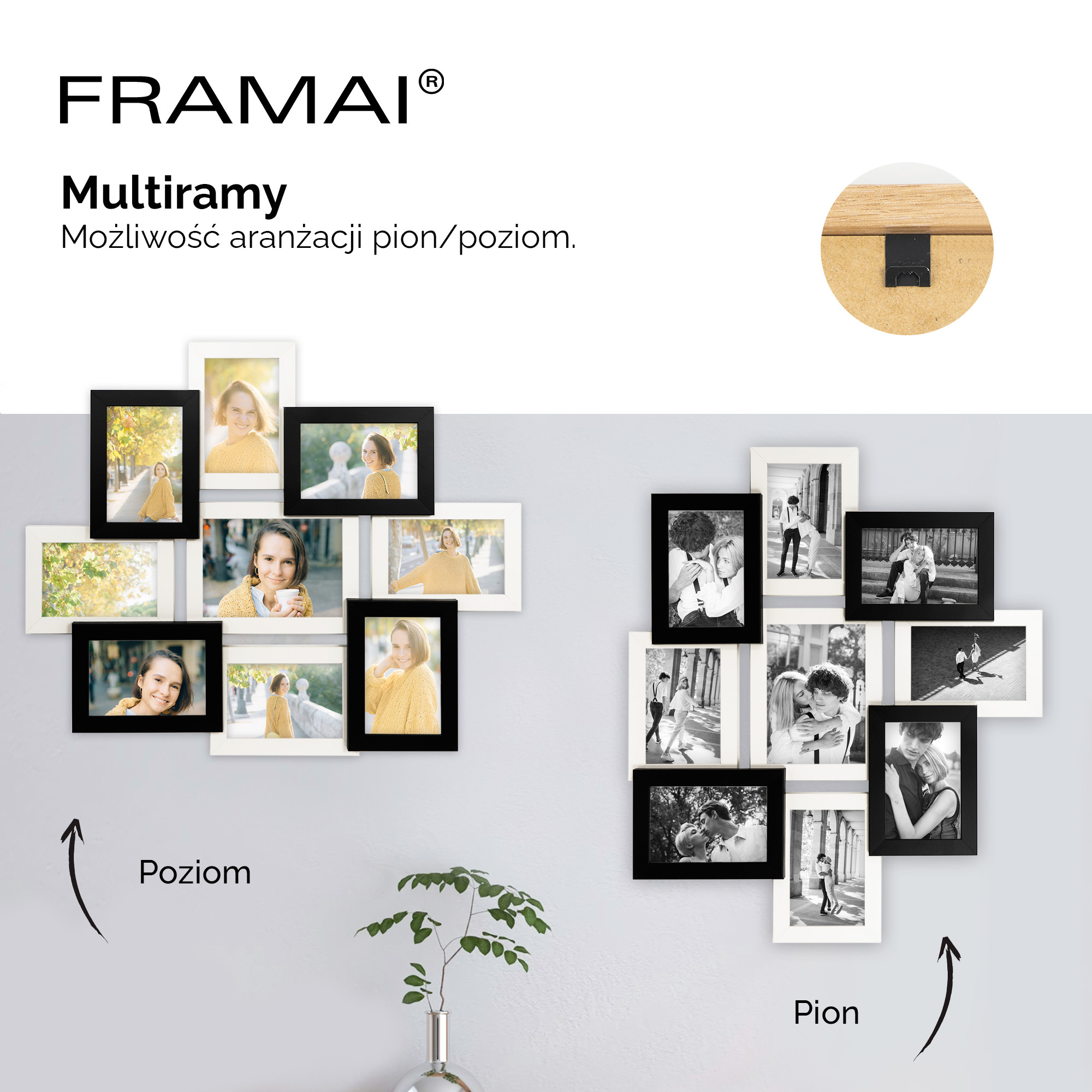 Konstrukcja multiramy wyróżnia się precyzyjnie wykonanymi narożnikami oraz trwałym montażem na stalowe wkręty, co gwarantuje solidność na długie lata. Dzięki elastycznym blaszkowym zapięciom, wymiana zdjęć jest prosta i szybka, co może sprawić radość całej rodzinie. Multirama posiada uniwersalną zawieszkę, dzięki której można ją wieszać zarówno pionowo, jak i poziomo, dopasowując do każdej aranżacji ściennej. Każda rama jest starannie zapakowana w tekturowe opakowanie oraz dodatkową folię ochronną, aby zapewnić bezpieczny transport i odbiór w nienaruszonym stanie.