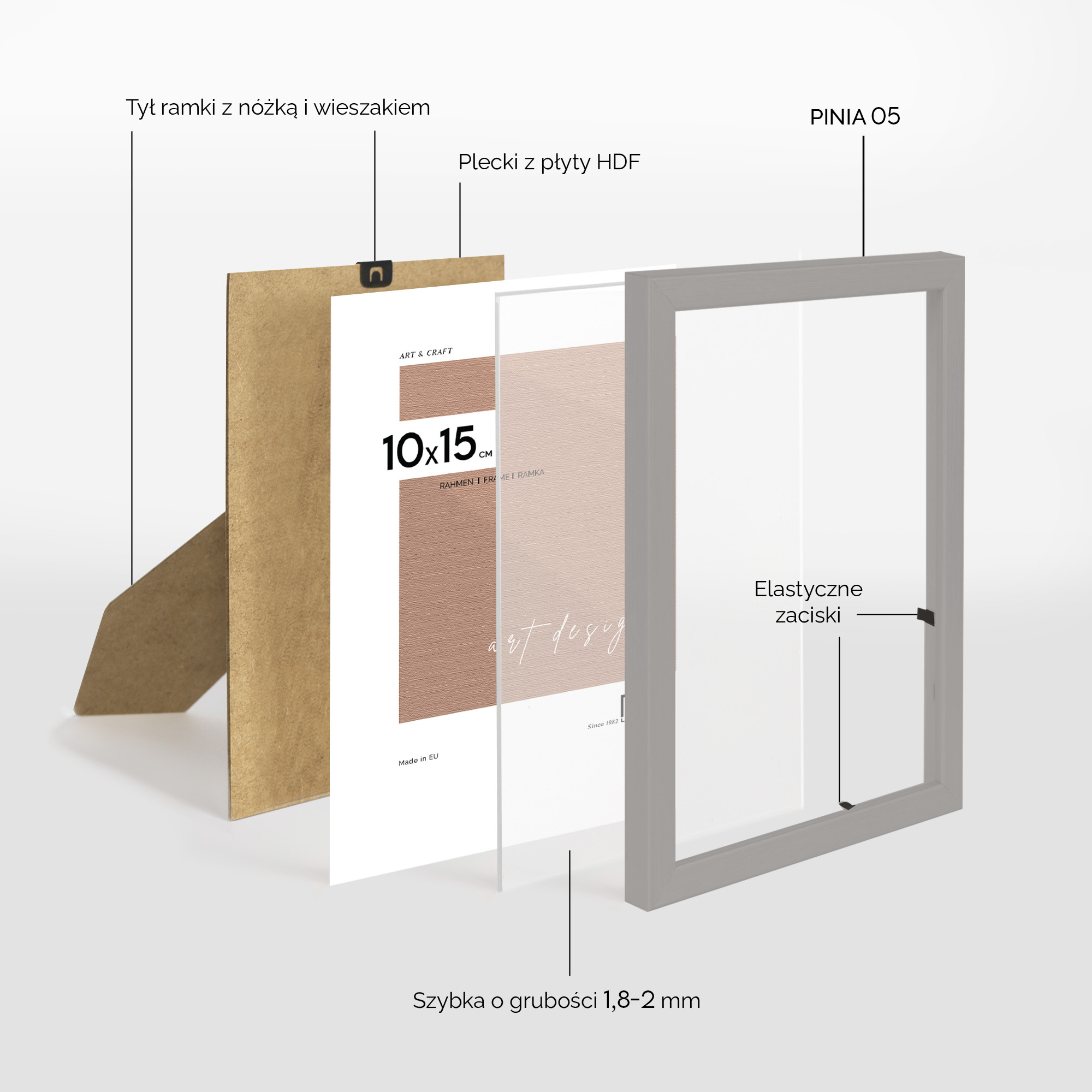 - Blaszki mocujące: miękkie blaszki mocujące tył ramki, zapewniają możliwość wielokrotnego otwierania