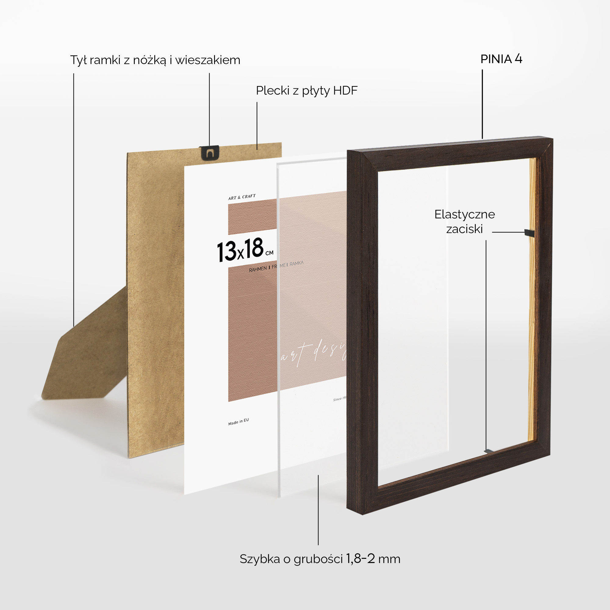- Blaszki mocujące: miękkie blaszki mocujące tył ramki, zapewniają możliwość wielokrotnego otwierania