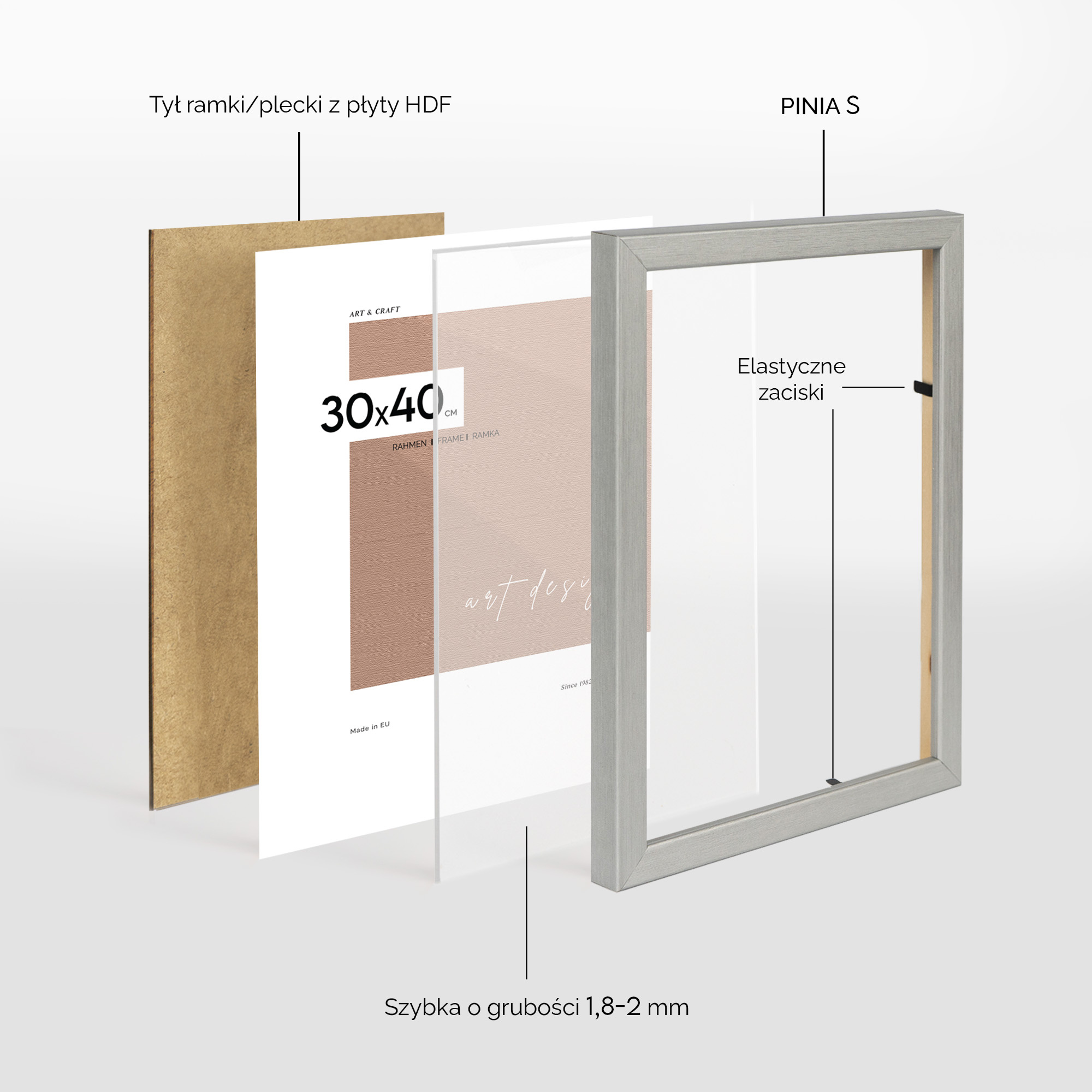 Nowoczesne ramki PINIA S w kolorze srebrnym z rozmiarem wewnętrznym 30x40 cm na zdjęcie, grafikę lub dyplom. Zostały wykonane w 100% z najwyższej jakości drewna sosnowego ze starannością i spasowaniem. Rama o profilu 11 mm x 14 mm nie przytłacza, budzi za to zainteresowanie i idealnie eksponuje zawartość.