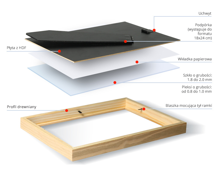 - Blaszki mocujące: miękkie blaszki mocujące tył ramki, zapewniają możliwość wielokrotnego otwierania