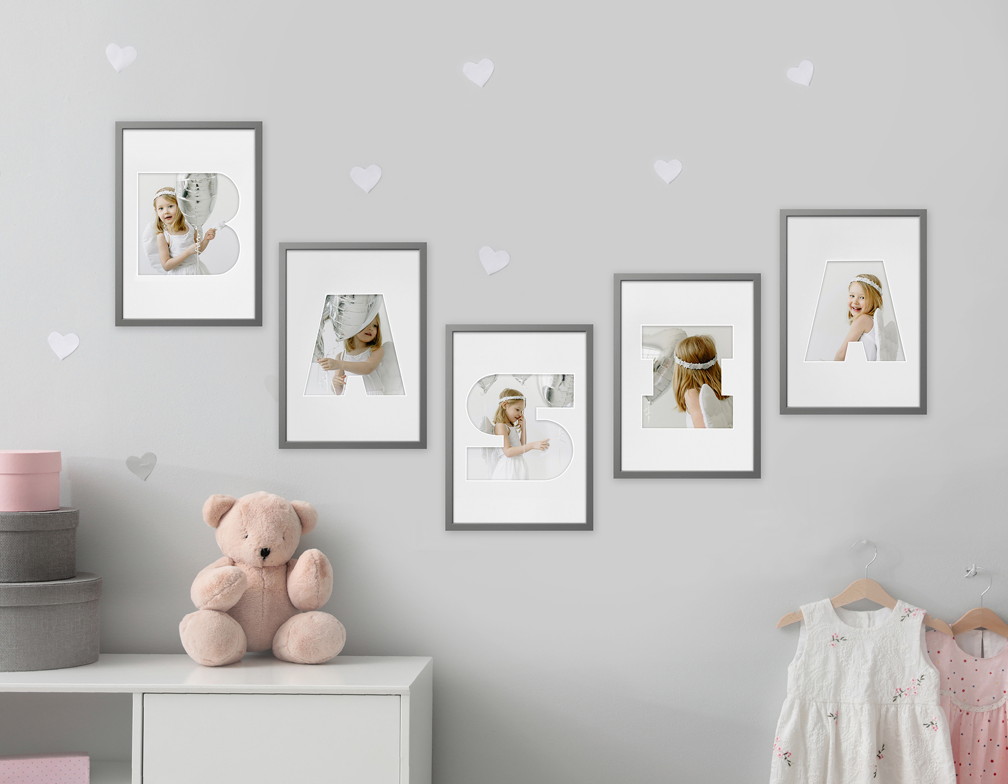 Passe partout można umieścić w białych, czarnych lub kolorowych ramkach tworząc z nich mini galerię na ścianie. Umieszczenie kilku ramek obok siebie pozwoli na ciekawe zaprezentowanie np. imienia dziecka i świetnie pasuje do dziecięcego pokoju. Jest to dekoracja, które sprawdzi się również w przestrzeniach biurowych, salonach kosmetycznych lub gabinetach lekarskich.