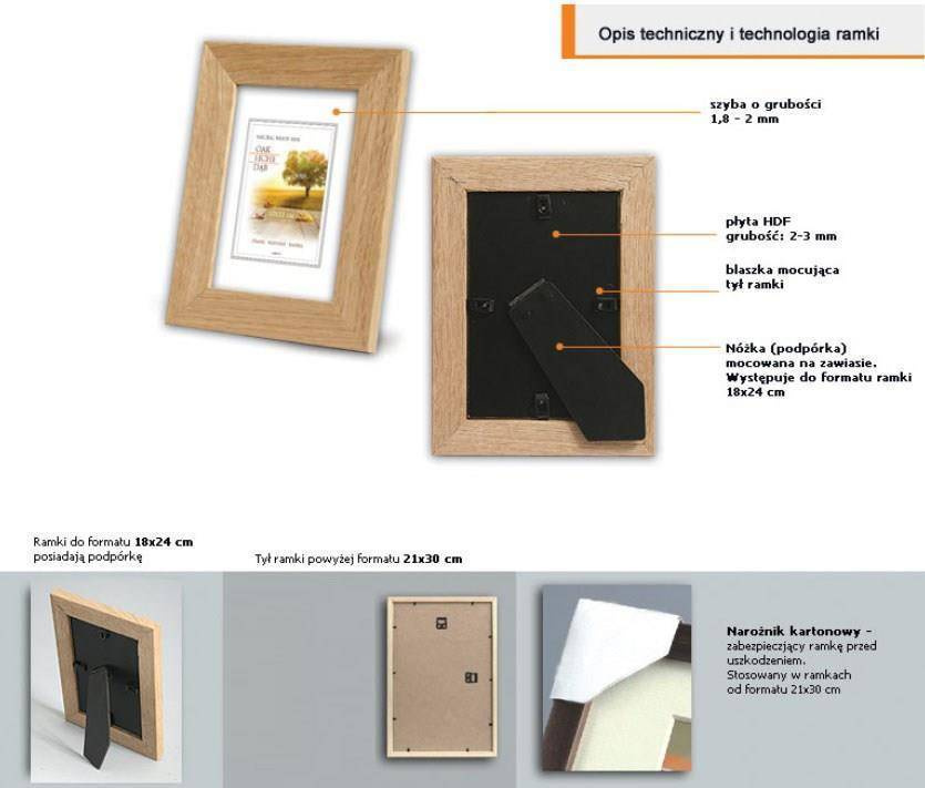 Ramka została w drewna dębowego gdzie z przodu zostało zastosowane szkło organiczne (plexi) a tył zabezpieczony został twardą płytą HDF. Do umieszczenia zdjęcia, grafiki lub dyplomu wystarczy odchylić miękkie blaszki mocujące pozwalające na wielokrotne otwieranie. W ramce DAB C 0 w rozmiarze 50x70 cm występuje stopka do postawienia na biurku (pion/poziom) oraz wieszak umożliwiający ekspozycję na ścianie (pion/poziom).