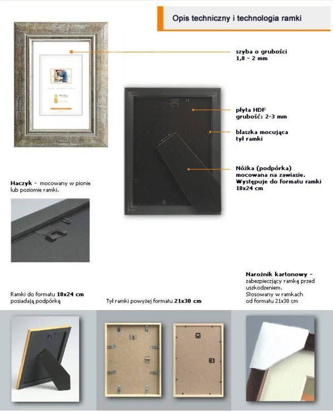 Oferowana ramka DRZ C S1 w rozmiarze 13x18 cm została stworzona z ramy o profilu 30x14 mm (szerokość, wysokość). Z przodu oprawione zdjęcie/grafika/dyplom chronione jest szkłem mineralne o grubości 2 mm. Z tyłu plecki wykonane z twardej płyty HDF. Ramka oprócz wieszaka do powieszenia na ścianie dodatkowo posiada stopkę / nóżkę która pozwala postawić ramkę na biurku lub regale.