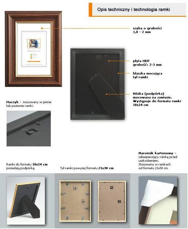 Oferowana ramka DRZ S 4 w rozmiarze 50x60 cm została stworzona z ramy o profilu 32x21 mm (szerokość, wysokość). Z przodu oprawione zdjęcie/grafika/dyplom chroni szkło organiczne o grubości 2 mm (Plexi), z tyłu plecki wykonane z twardej płyty HDF. Ramka posiada miękkie blaszki mocujące na tylnym panelu, umożliwiające wielokrotne otwieranie i wymianę zdjęć. Wieszak metalowy pozwala na ekspozycję na ścianie w orientacji pionowej lub poziomej.