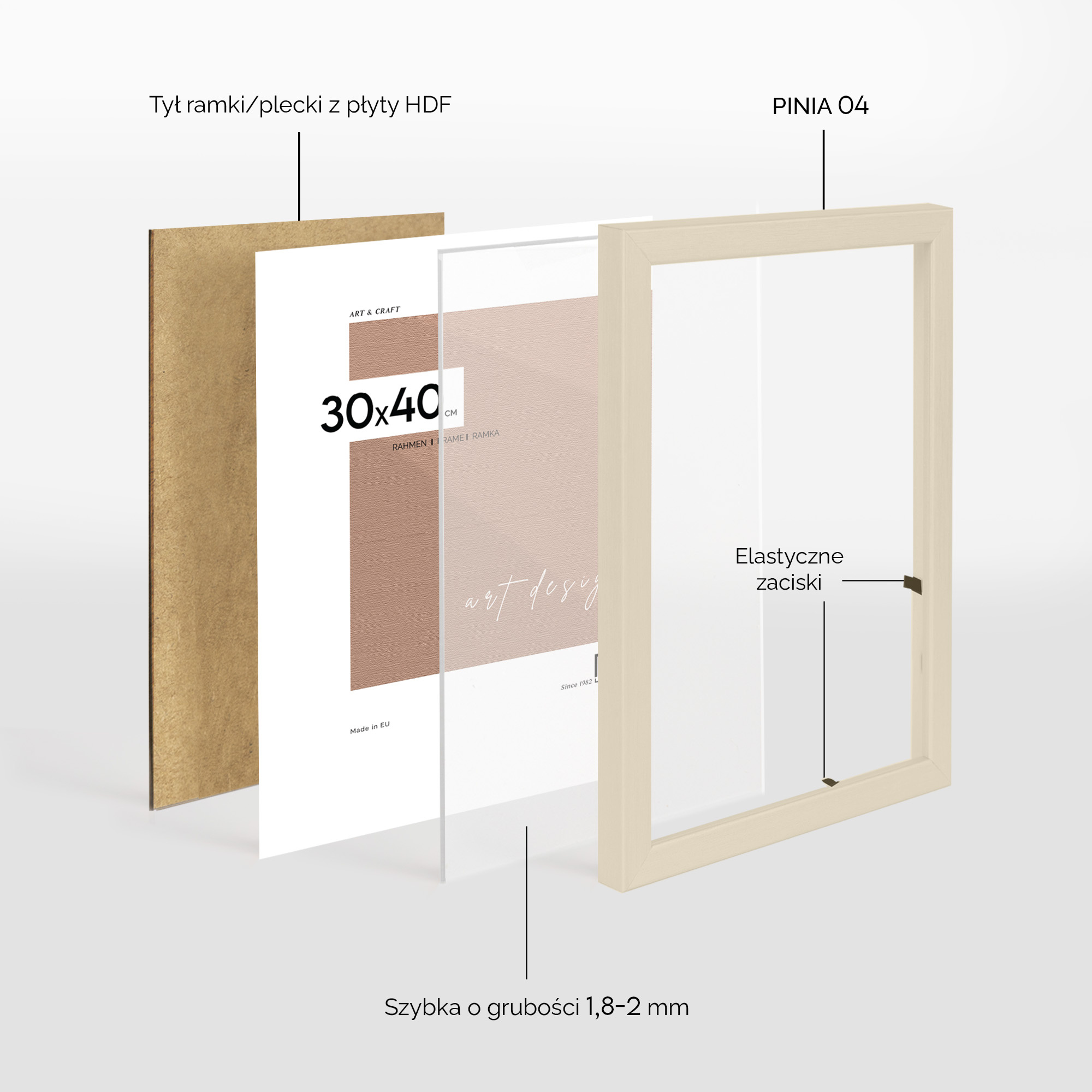 Nowoczesna ramka PINIA 04 w kolorze kremowym z rozmiarem wewnętrznym 30x40 cm na zdjęcie, grafikę lub dyplom. Została wykonana w 100% z najwyższej jakości drewna sosnowego ze starannością i spasowaniem. Rama o profilu 11 mm x 14 mm nie przytłacza, budzi za to zainteresowanie i idealnie eksponuje zawartość.