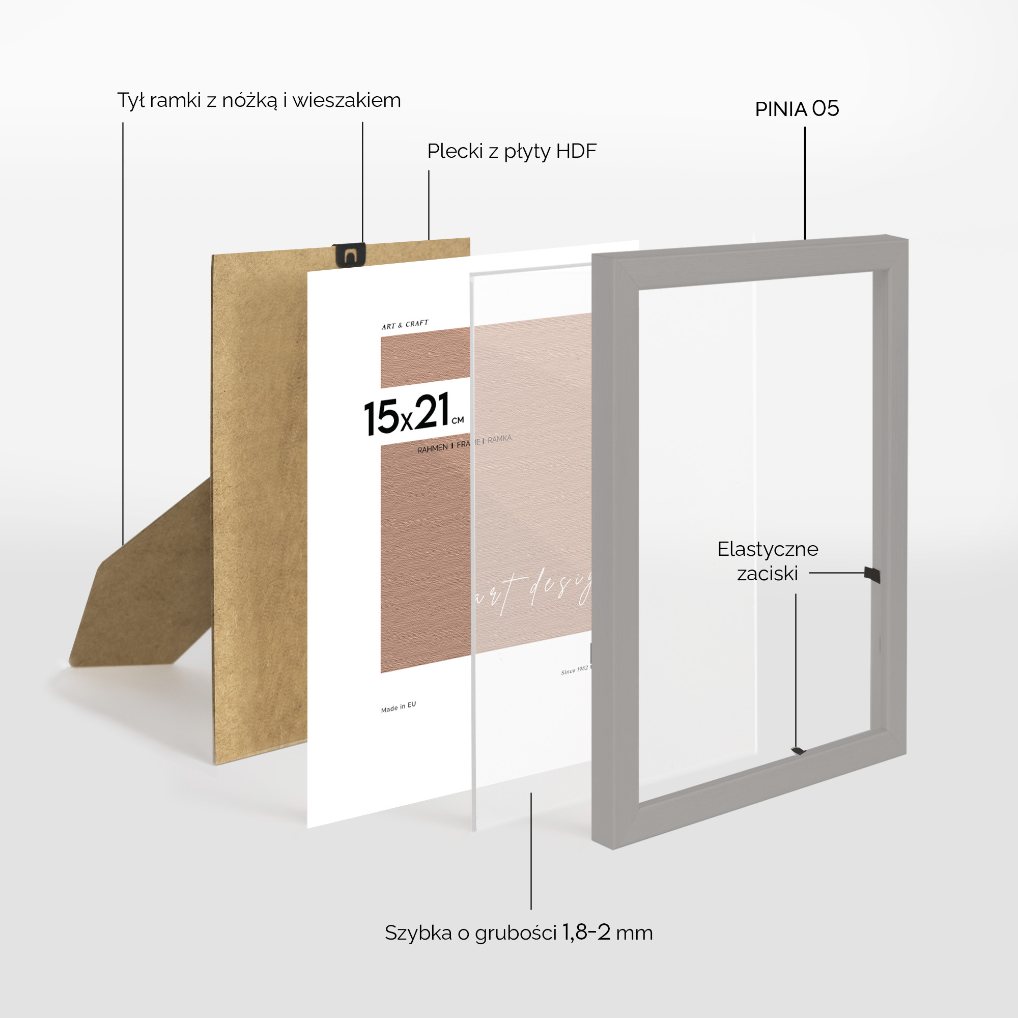 Nowoczesna ramka PINIA 05 w kolorze popielatym z rozmiarem wewnętrznym 15x21 cm na zdjęcie, grafikę lub dyplom. Została wykonana w 100% z najwyższej jakości drewna sosnowego ze starannością i spasowaniem. Rama o profilu 11 mm x 14 mm nie przytłacza, budzi za to zainteresowanie i idealnie eksponuje zawartość.