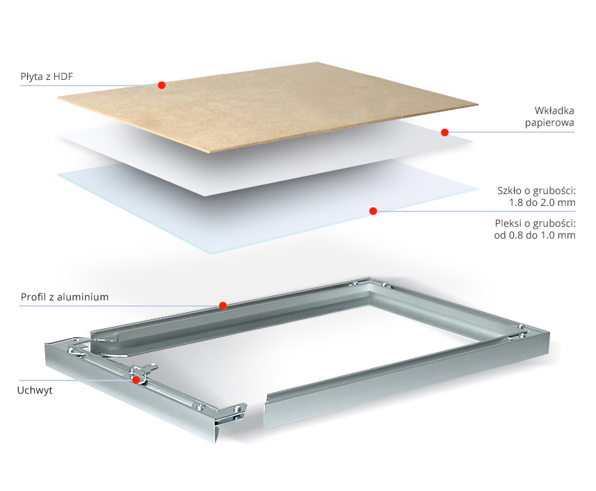 - Przód oprawy: plexi o dużej przezroczystości i wytrzymałości na pęknięcia. Tył oprawy: wykonany jest z twardej płyty HDF.