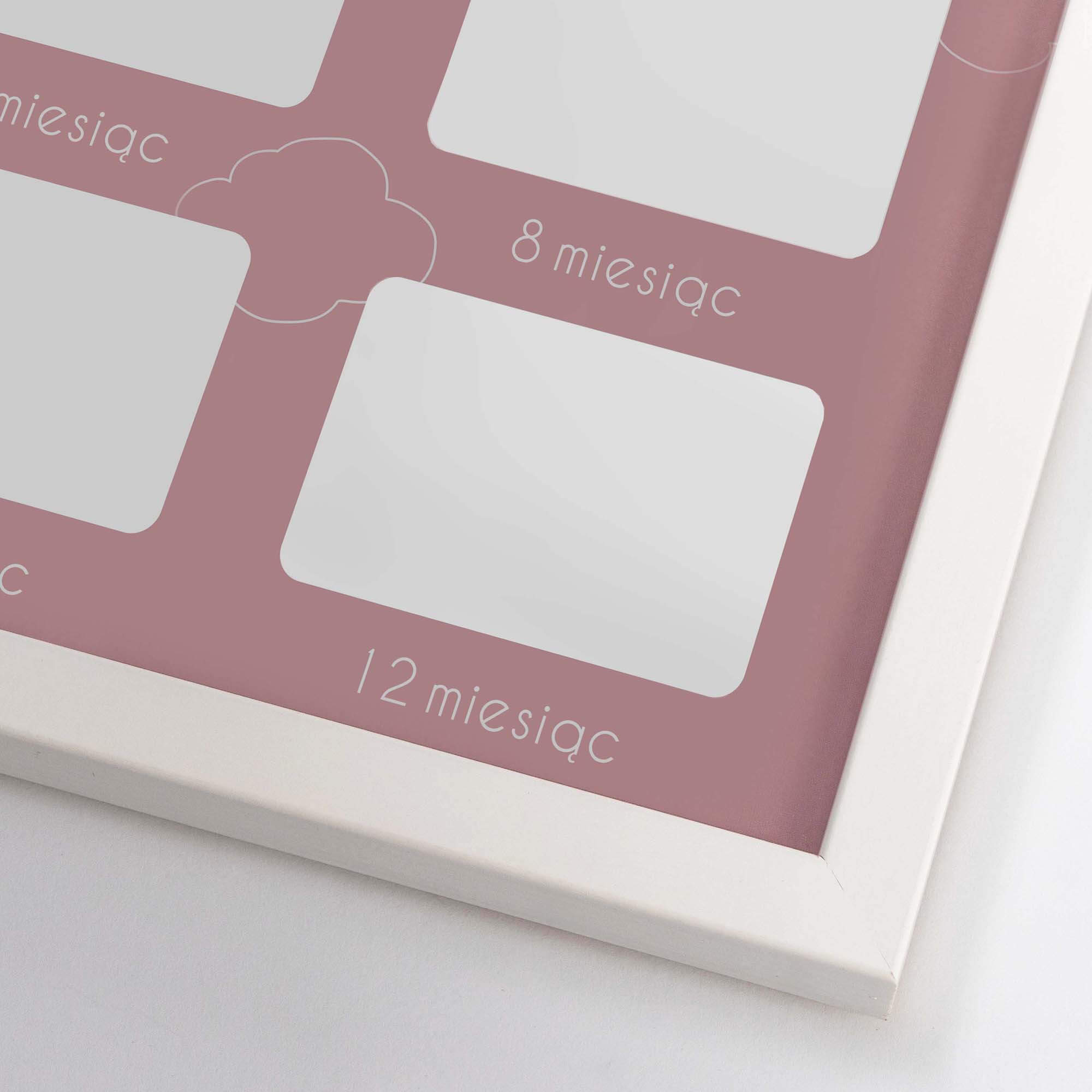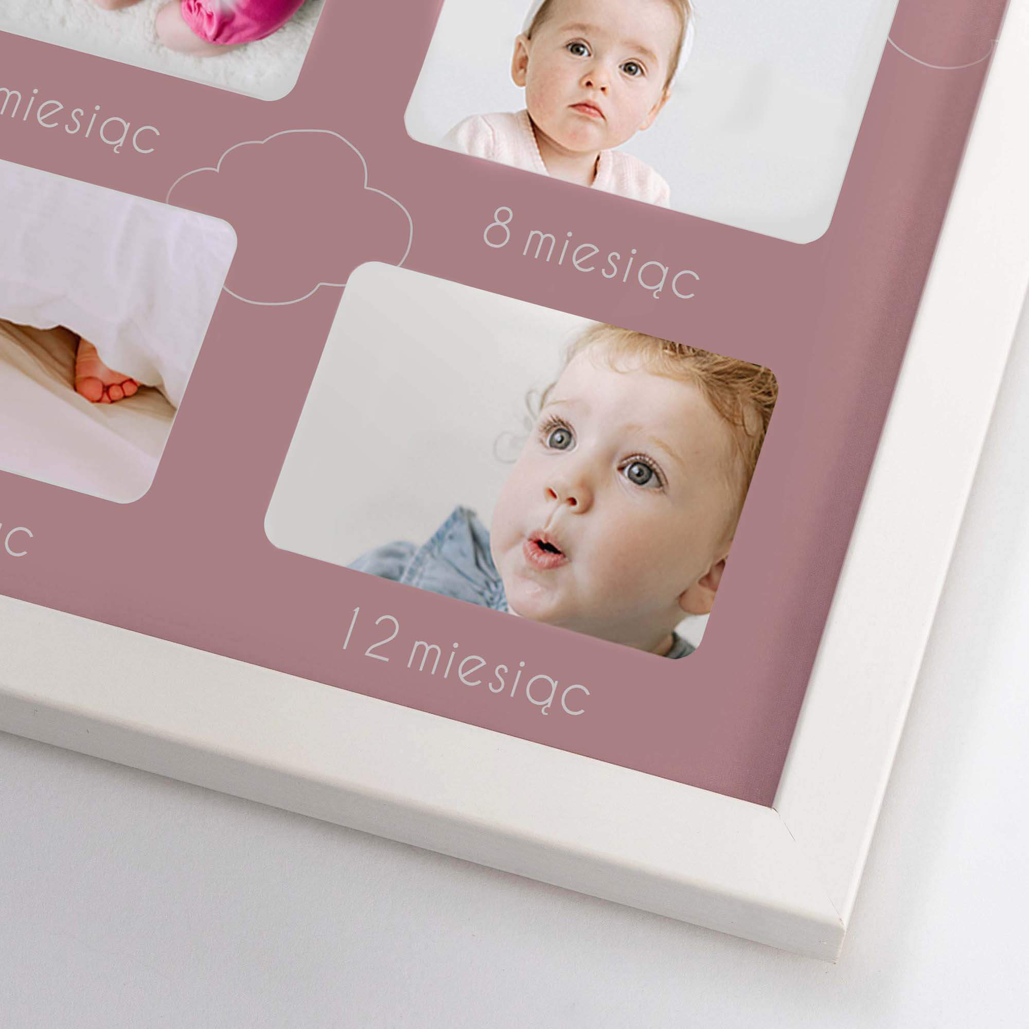 Dołączone do ramki passe partout pozwala na wykonanie kolażu 12 zdjęć o rozmiarze 4x6 cm. Wystarczy wywołać kilka fotografii i umieścić je w ramce, aby stworzyć niebanalną kompozycję w formie kalendarza z pierwszego roku maluszka.