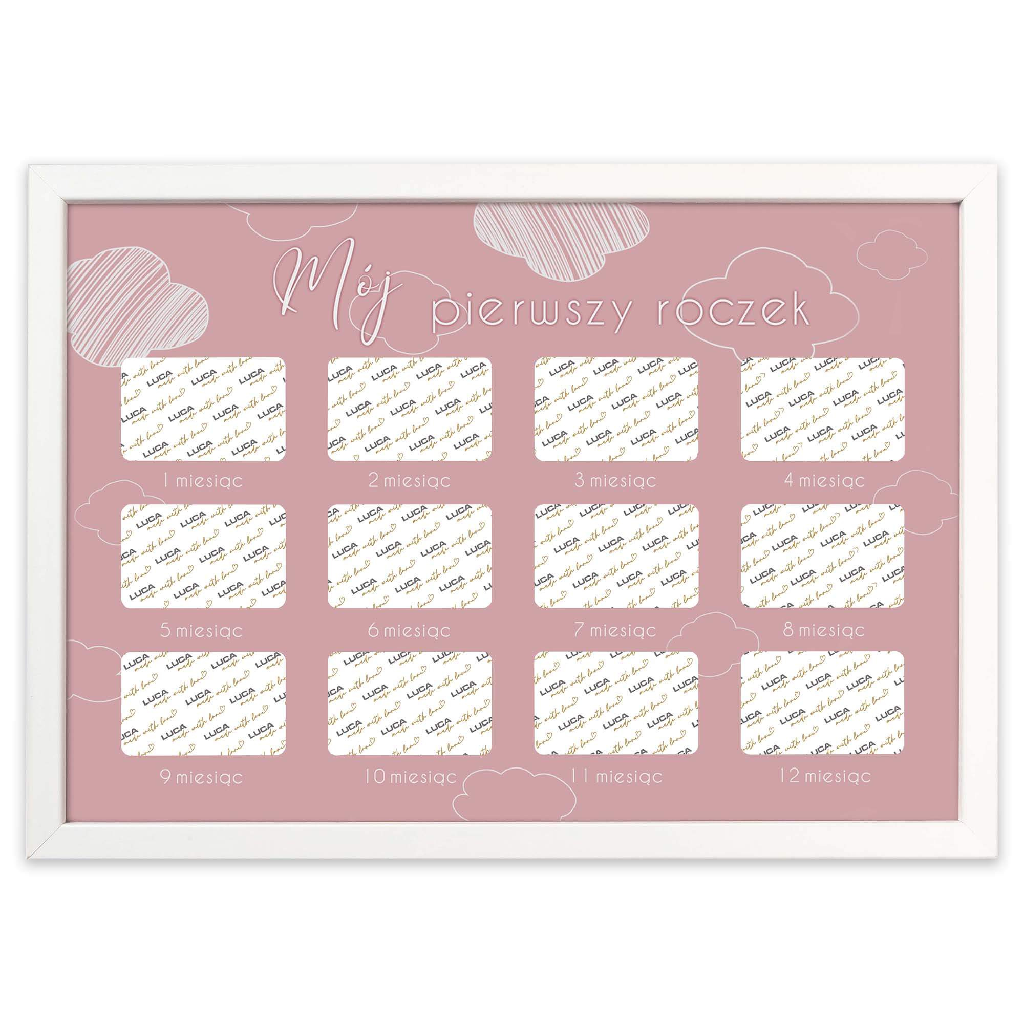 Ramka drewniana z Passe Partout kalendarz MÓJ PIERWSZY ROCZEK - DZIEWCZYNKA o rozmiarze 21x30 cm