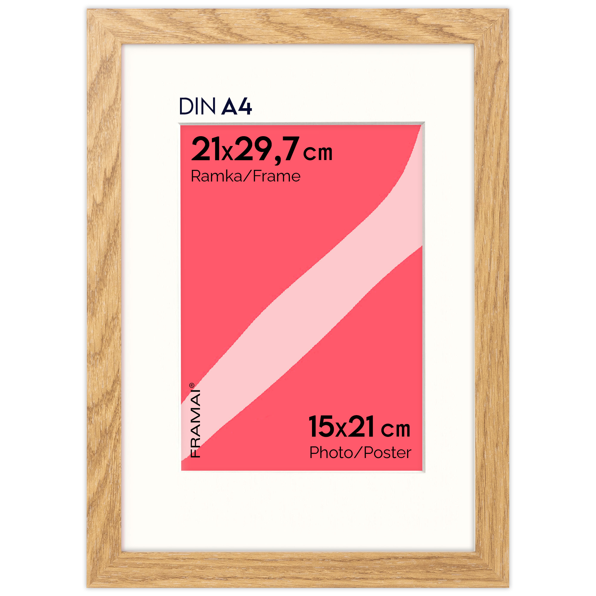 Odkryj wartość swoich najcenniejszych wspomnień dzięki naszej eleganckiej ramce HEN o rozmiarze 21x29,7 cm, wyposażonej w passe-partout z  15x21 cm. Precyzyjnie wykonana w kolorze naturalnego dębu z wysokiej jakości EKO materiału, doskonale podkreśla piękno zdjęć, grafik i plakatów. Minimalistyczny design, szerokość profilu 20 mm, oraz klasyczna forma sprawiają, że pasuje do każdego wnętrza.