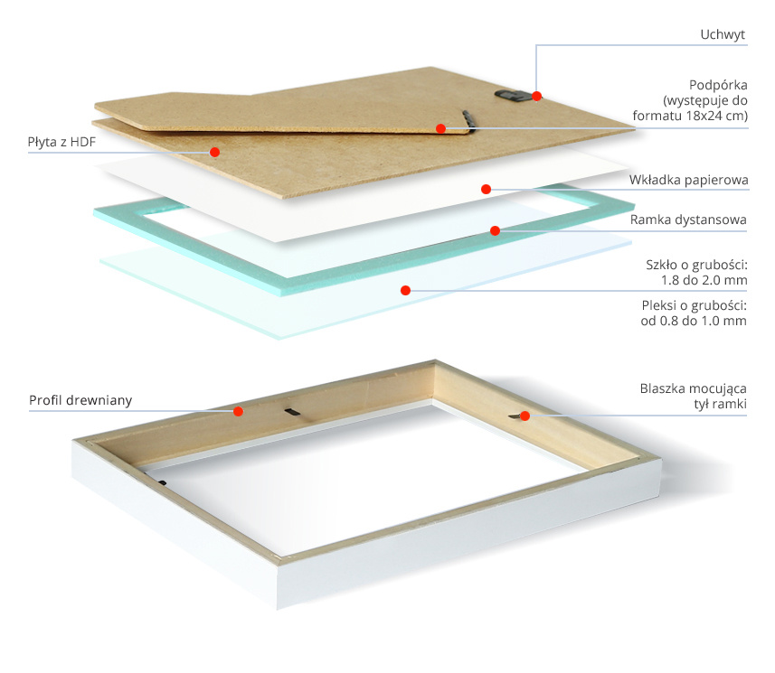• Blaszki mocujące: miękkie blaszki mocujące tył ramki, zapewniają możliwość wielokrotnego otwierania
