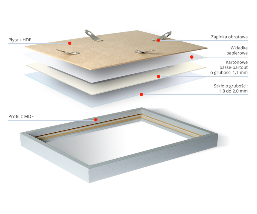 • Blaszki mocujące: miękkie blaszki mocujące tył ramki, zapewniają możliwość wielokrotnego otwierania