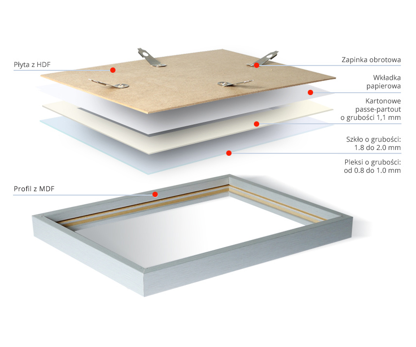 • Blaszki mocujące: miękkie blaszki mocujące tył ramki, zapewniają możliwość wielokrotnego otwierania