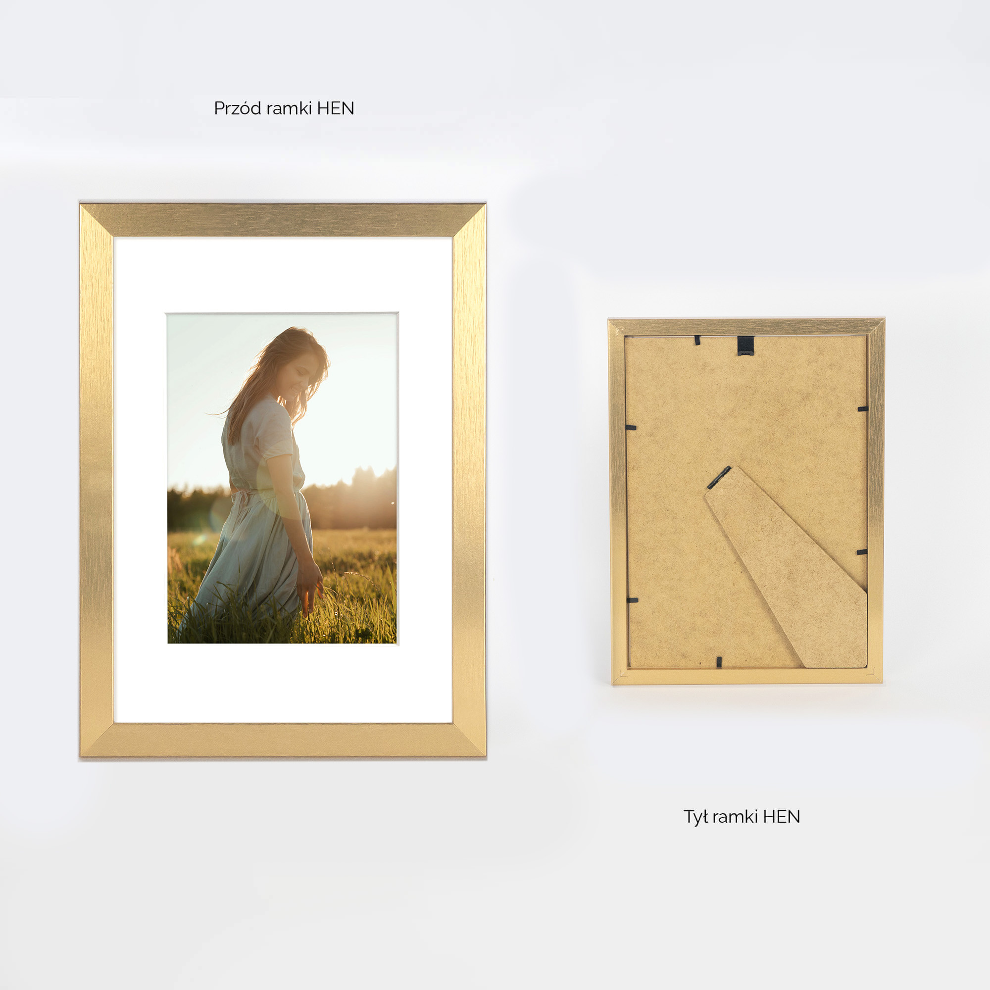 Odkryj wartość swoich najcenniejszych wspomnień dzięki naszej eleganckiej ramce HEN o rozmiarze 21x29,7 cm, wyposażonej w passe-partout do zdjęć 15x21 cm. Precyzyjnie wykonana w kolorze złotym z wysokiej jakości EKO materiału, doskonale podkreśla piękno zdjęć, grafik i plakatów. Minimalistyczny design, szerokość profilu 20 mm, oraz klasyczna forma sprawiają, że pasuje do każdego wnętrza.