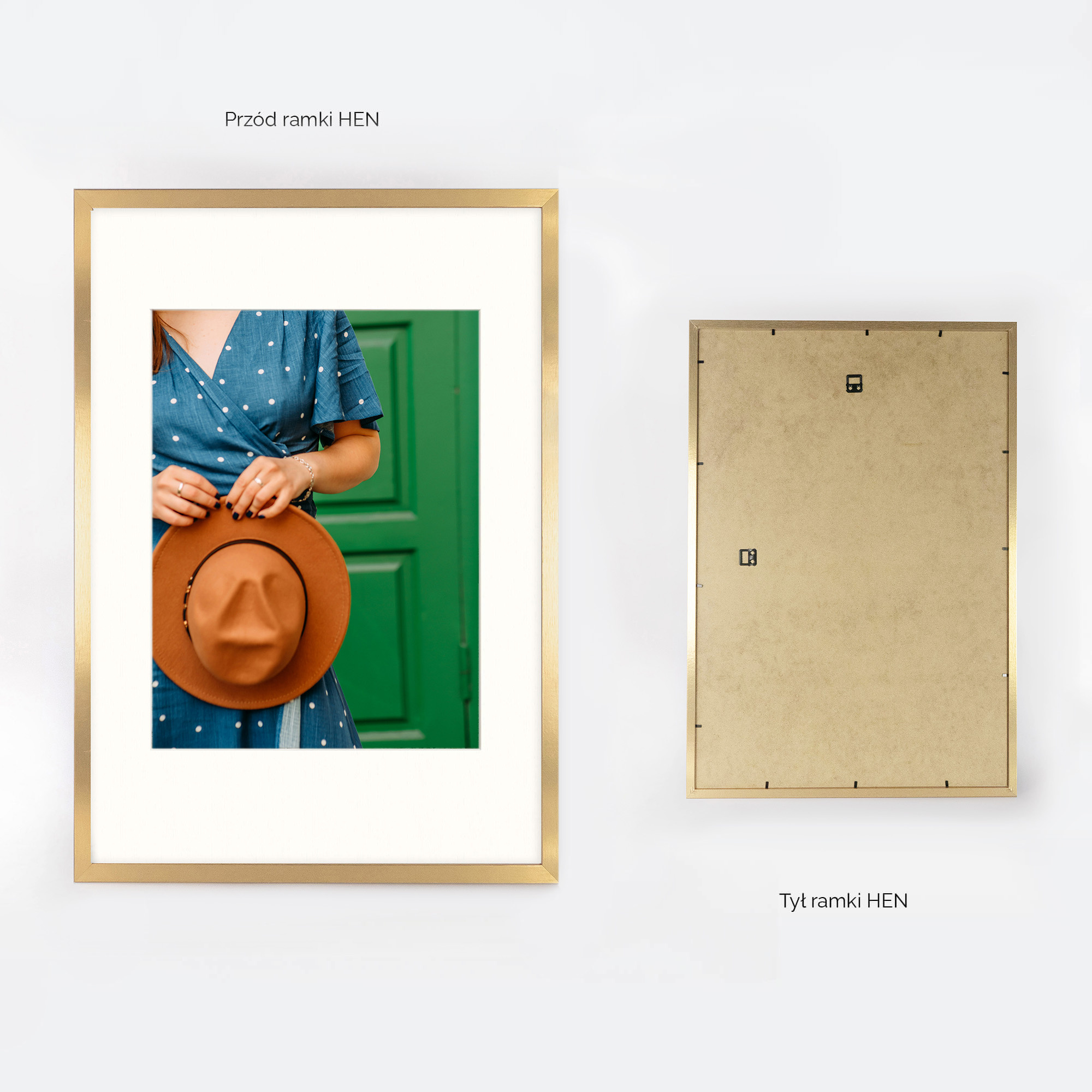 Ramka z serii HEN w kolorze złotym. Zawiera passe-partout dostosowane do pracy 30x40 cm oraz front z bezpiecznej plexi odpornej na stłuczenia. Funkcjonalne rozwiązanie do estetycznej prezentacji zdjęć, plakatów i grafik zarówno w przestrzeniach domowych, jak i komercyjnych.