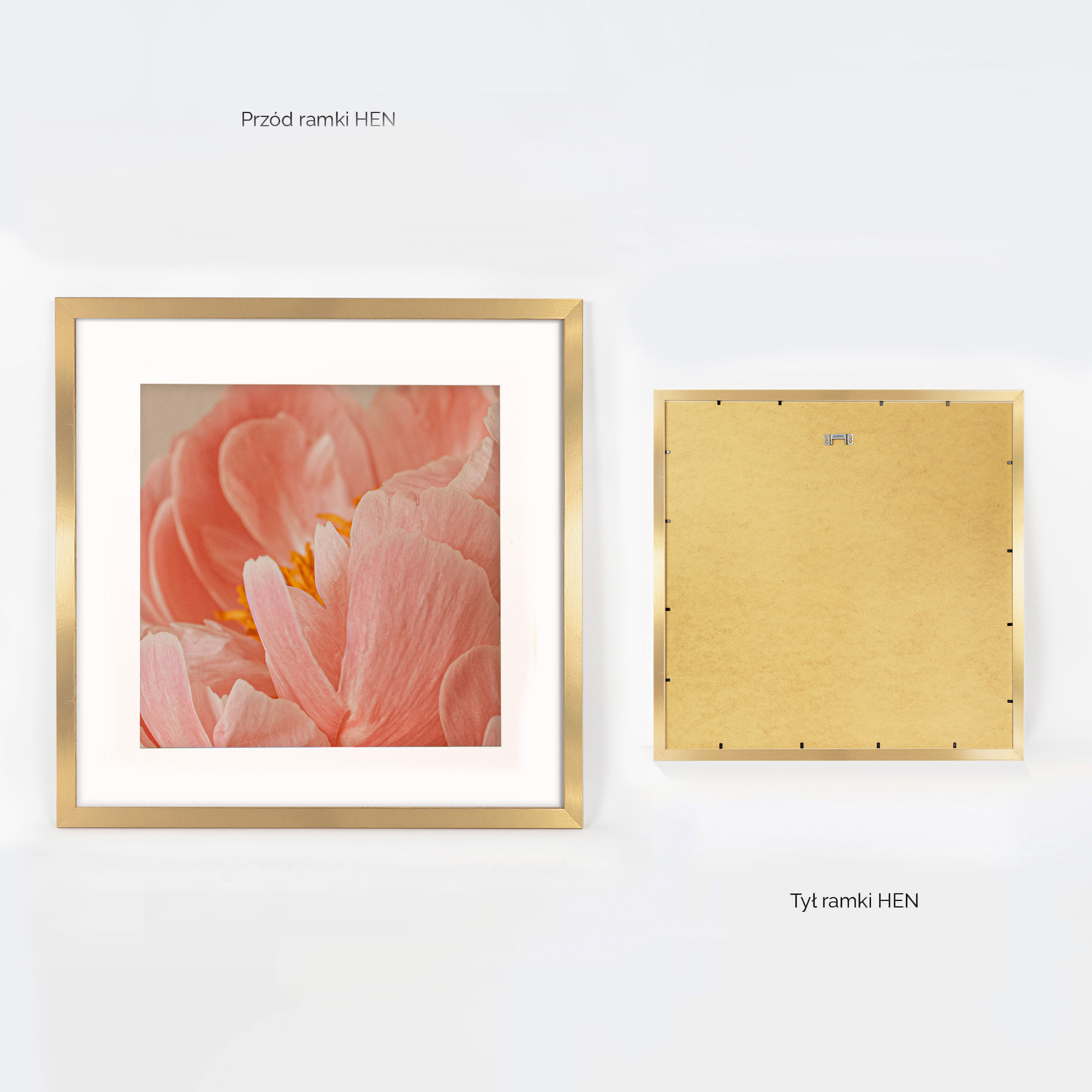 Ramka z serii HEN w kolorze złotym. Zawiera passe-partout dostosowane do pracy 40×40 cm oraz front z bezpiecznej plexi odpornej na stłuczenia. Funkcjonalne rozwiązanie do estetycznej prezentacji zdjęć, plakatów i grafik zarówno w przestrzeniach domowych, jak i komercyjnych.